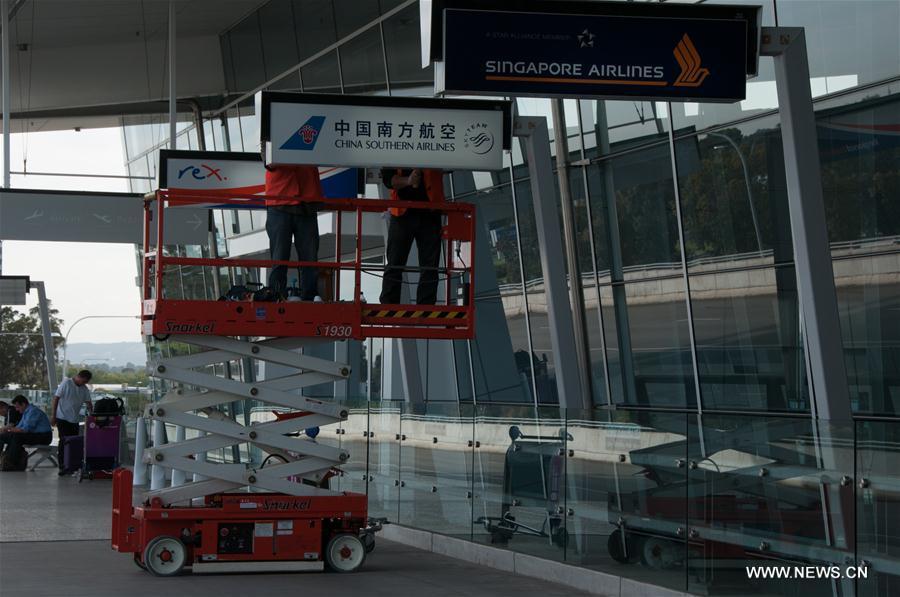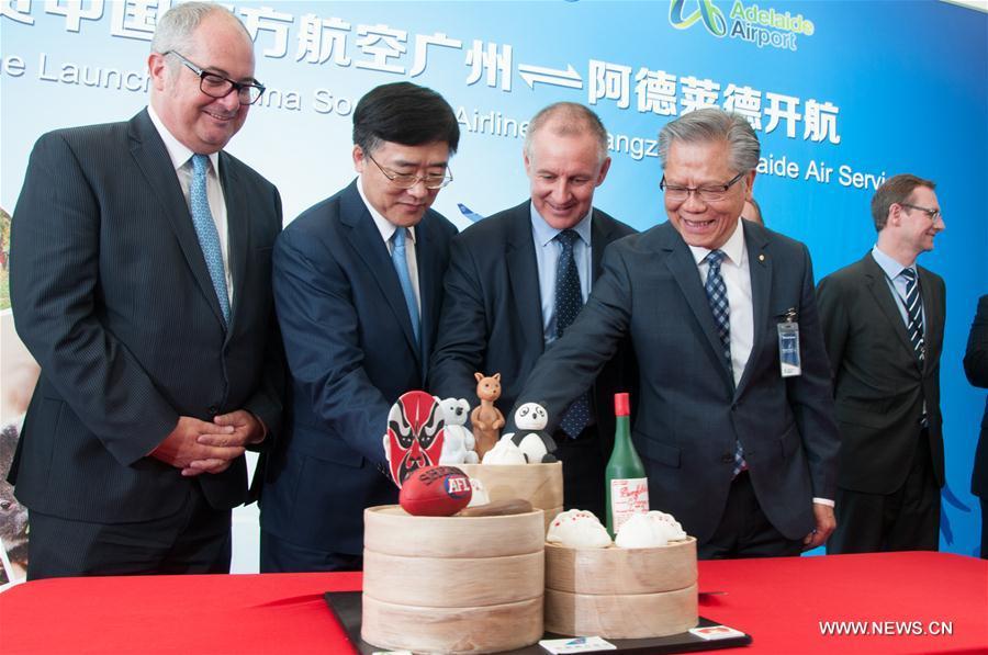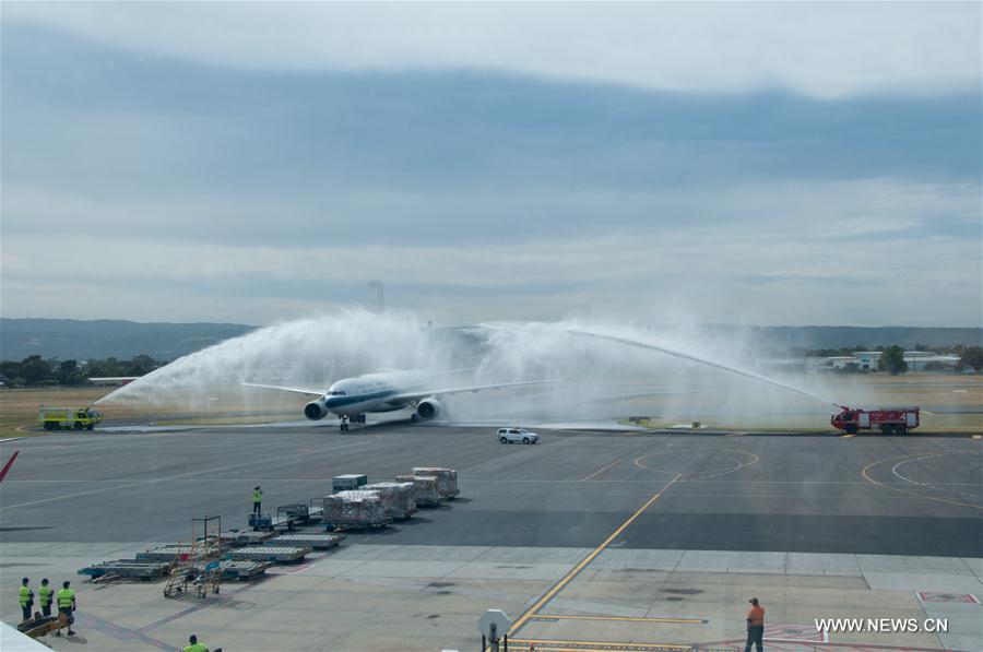 China Southern Airlines CZ663, the first direct flight from Guangzhou to Adelaide is received with water-cannon salute after it touched down at the Adelaide Airport, Australia, Dec. 13, 2016. The first direct flight from southern Chinese city of Guangzhou arrived in Adelaide on Tuesday. Adelaide Airport welcomed the major flight with a water-cannon salute. (Photo:Xinhua/Xu Haijing)