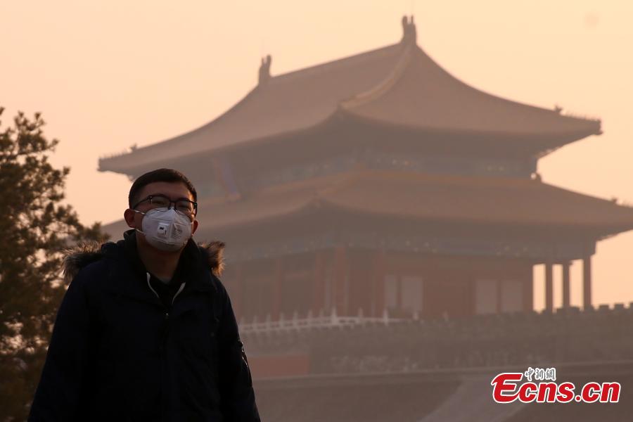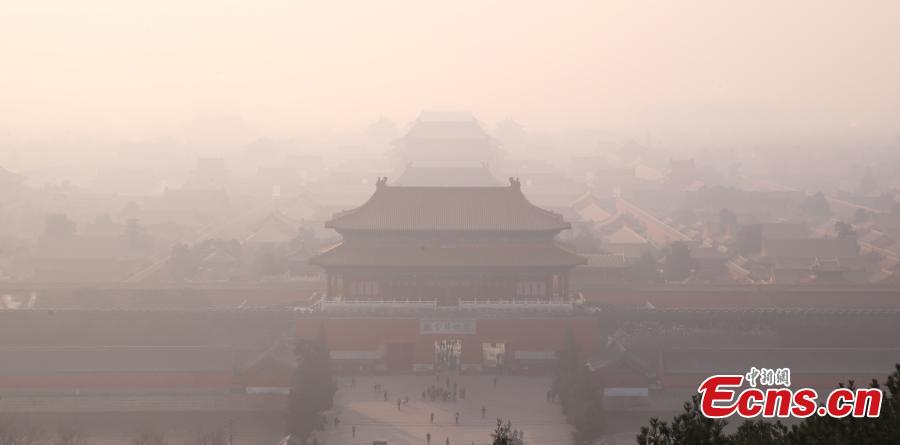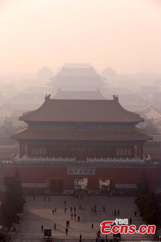 The forbidden city in Beijing is engulfed in severe smog on Sunday, Dec. 18th, 2016. The worst air pollution so far this winter began moving into Beijing on Friday and is expected to last for over five days. The city issued its first red alert for air pollution on Dec. 15th and emergency measures have been taken to tackle the pollution.(Photo: China News Service/Han Haidan)