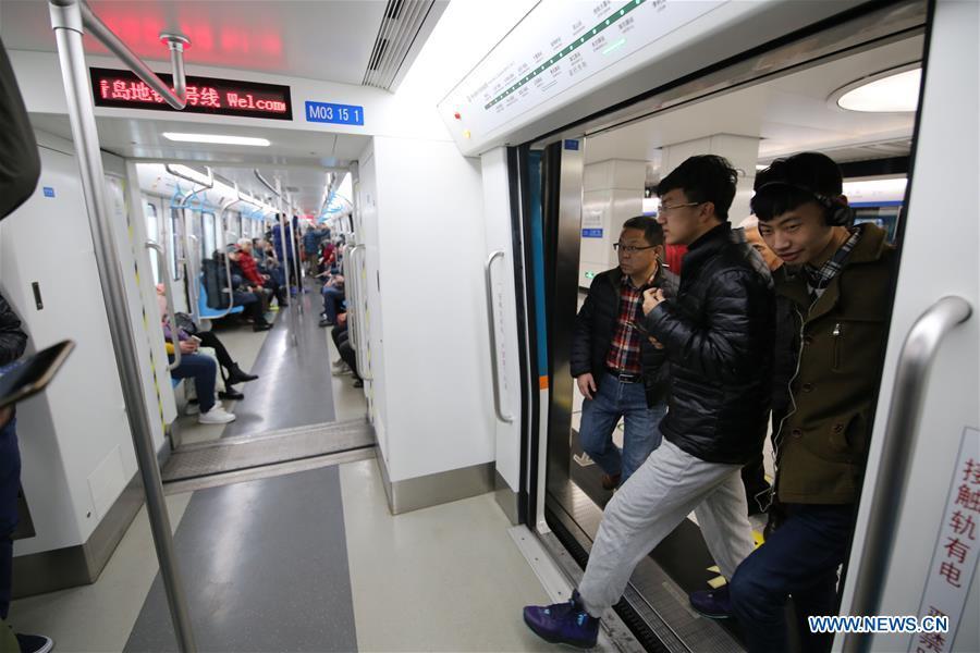 Passengers get in the Qingdaozhan Station of the subway line 3 in Qingdao, east China's Shandong Province, Dec. 18, 2016. Qingdao's subway line 3, the first subway line in Shandong Province, was officially opened on Sunday. (Xinhua/Zhang Jin'gang)
