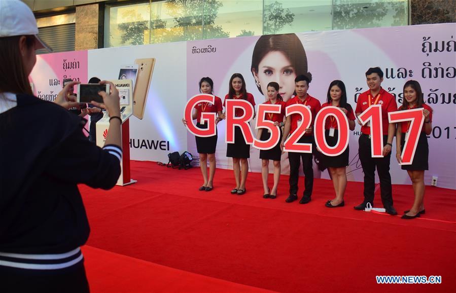 Models take selfies by a Huawei smart phone in Vientiane, Laos, Dec. 17, 2016. Huawei Technologies introduced Huawei GR5 2017 into the market of Laos in Vientiane on Saturday. (Photo:Xinhua/Liu Ailun)