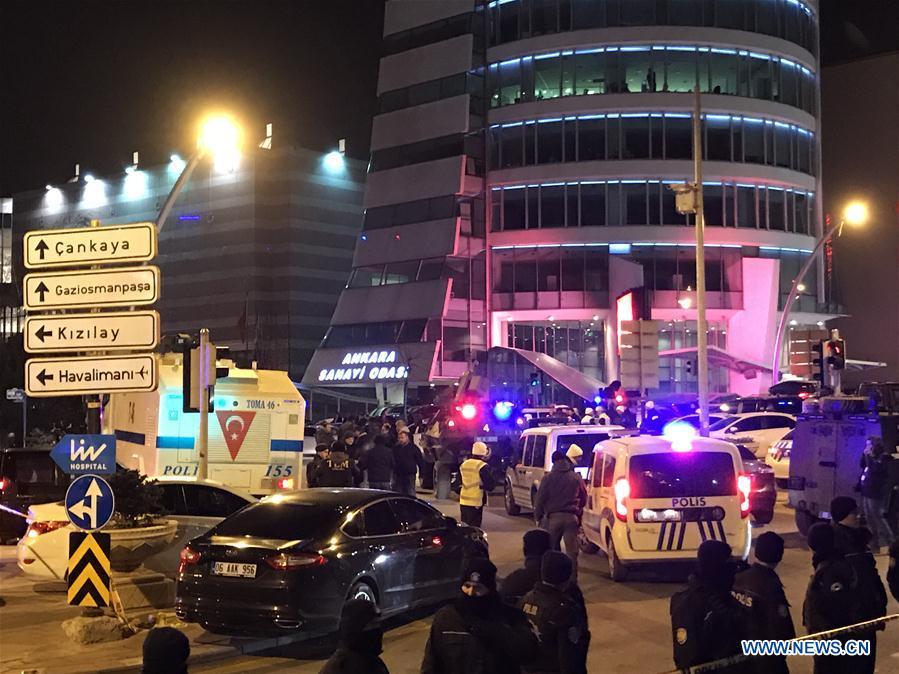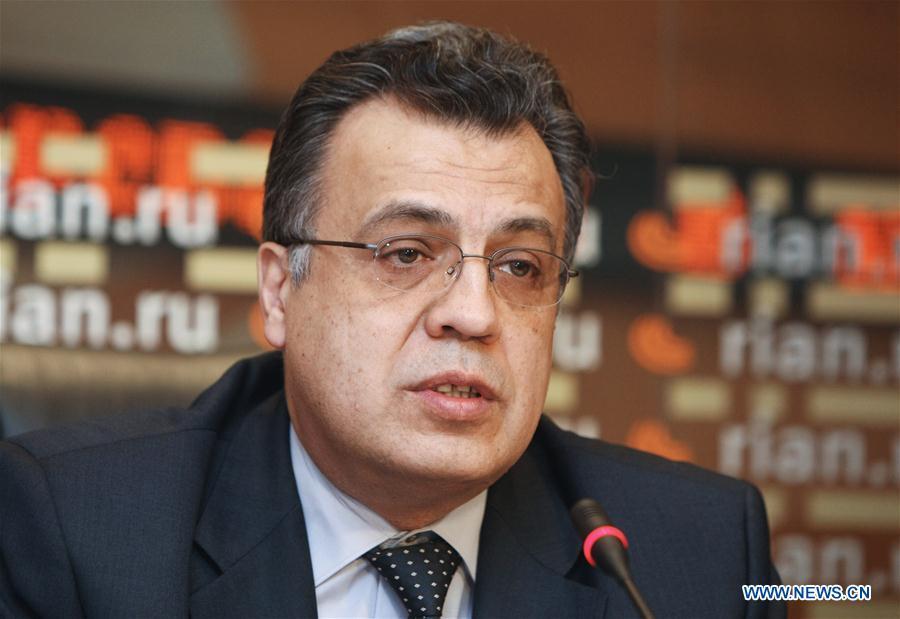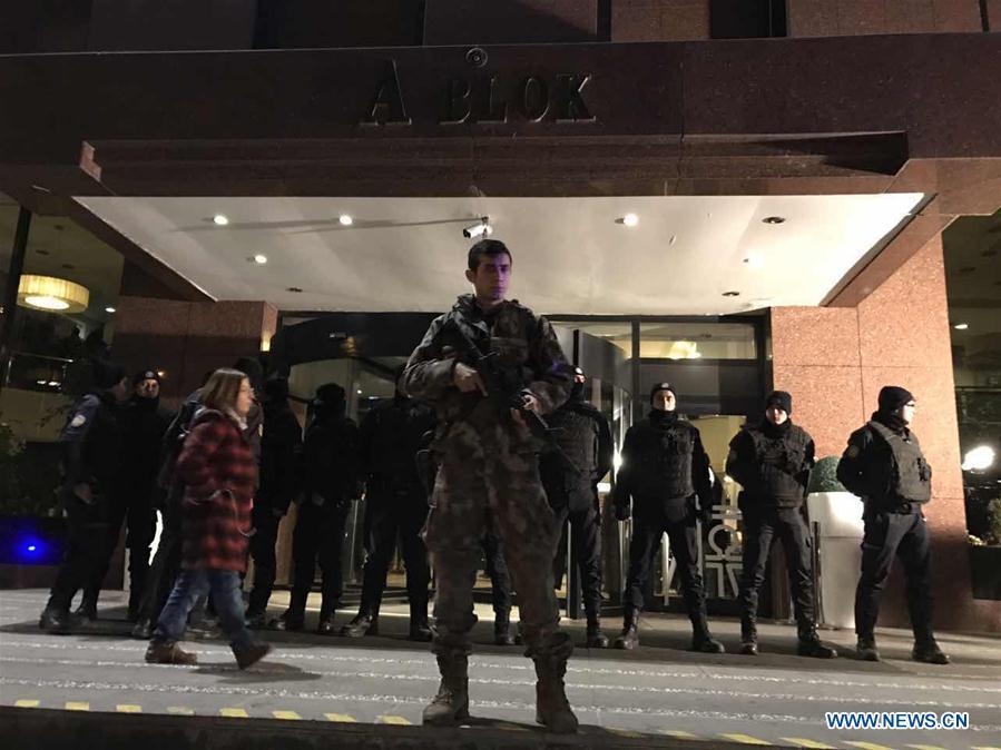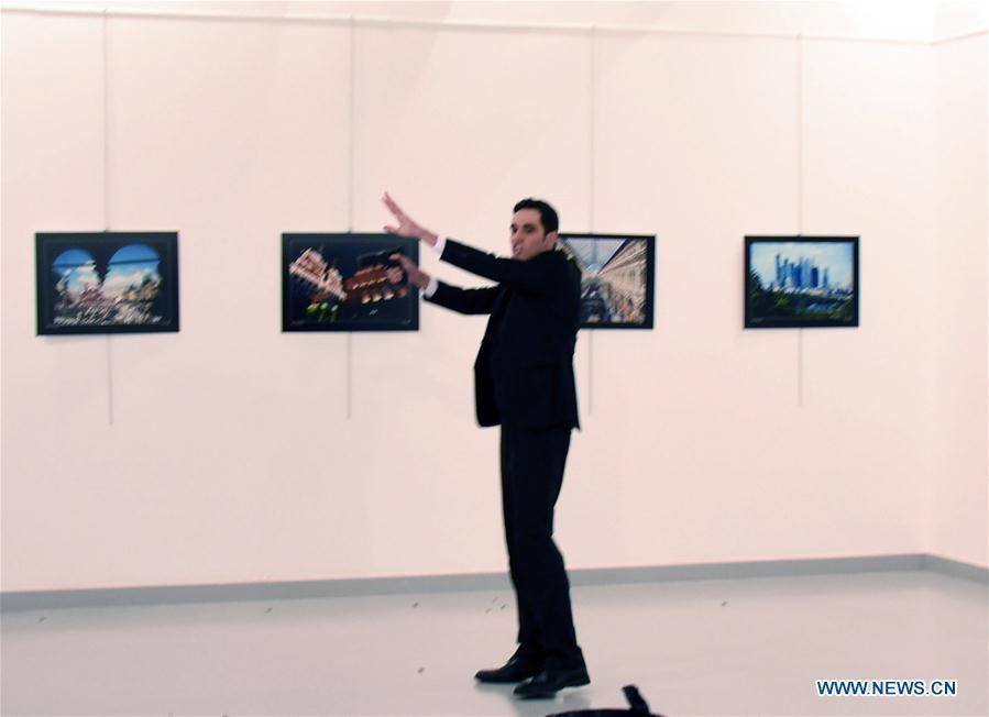 The gunman is seen at the shooting site of Russian Ambassador to Turkey Andrey Karlov in a modern art exhibition center in Ankara, Turkey, Dec. 19, 2016. The Russian Foreign Ministry confirmed that the country's Ambassador to Turkey Andrey Karlov had died in a gunman attack on Monday in Ankara, and the ministry declared the attack a terrorist act. (Xinhua)