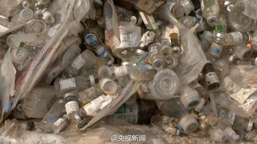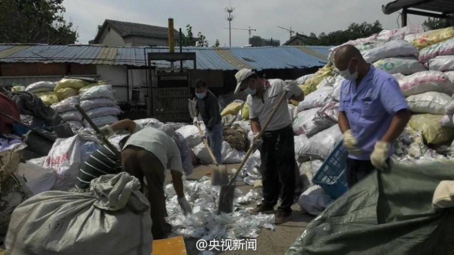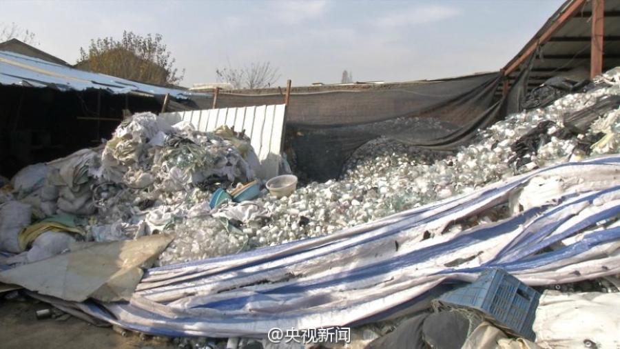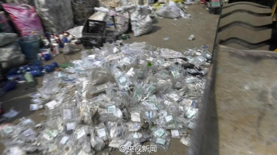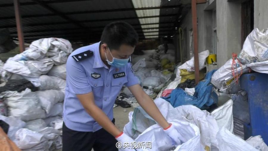 Police officers check medical waste including used infusion tubes and syringe needles at an illegal disposal center in Nanjing, East China’s Jiangsu province. Medical scrap from major hospitals of the city were sold to unauthorized disposal centers at a low price and processed into toys and tableware. Three suspects involved in the case were prosecuted for crimes of environmental pollution. Further investigation is underway. (Photo/Weibo account of CCTV)