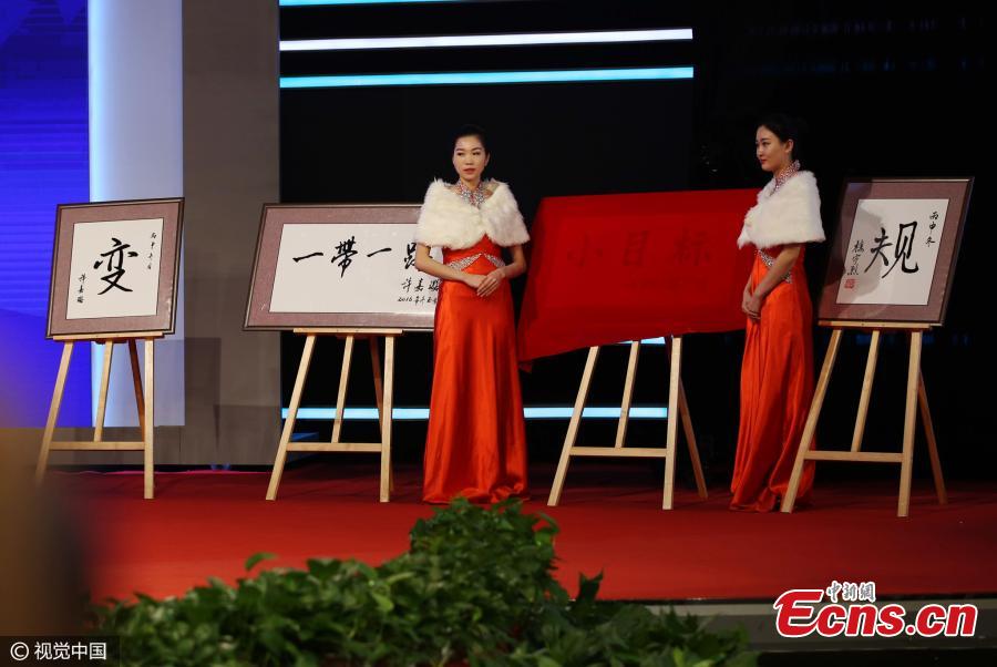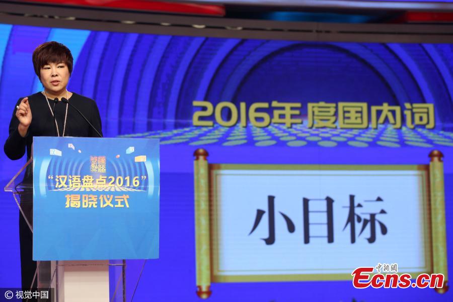 Chinese character "Gui", or "rule," has been chosen by Chinese netizens as the character of 2016. "Xiaomubiao", which means "small target", has been found the most popular word of the year in China. The word was from remarks of Chinese billionaire Wang Jianlin who suggested young people should not be “too ambitious” and should "set a small target first, like earning 100 million yuan ($14.4 million)," during a television show in August, 2016. Meanwhile, "Change" and "One Belt One Road" have been chosen as words of 2016 for the world. The top buzzwords were announced at an event co-sponsored by the National Language Resources Monitoring and Research Center, the Commercial Press, and People’s Daily Online on December 21, 2016 in Beijing. (Photo/CFP)