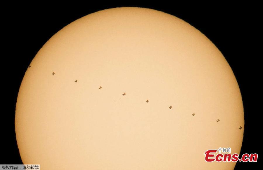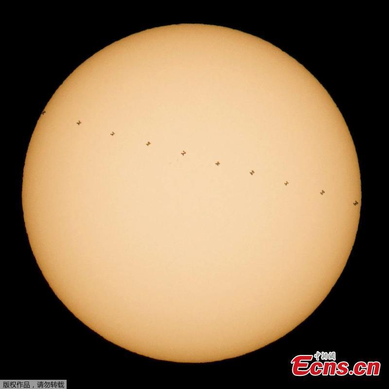 This composite image, made from ten frames, shows the International Space Station, with a crew of six onboard, in silhouette as it transits the sun at roughly five miles per second, Saturday, Dec. 17, 2016, from Newbury Park, California.(Photo/Agencies)