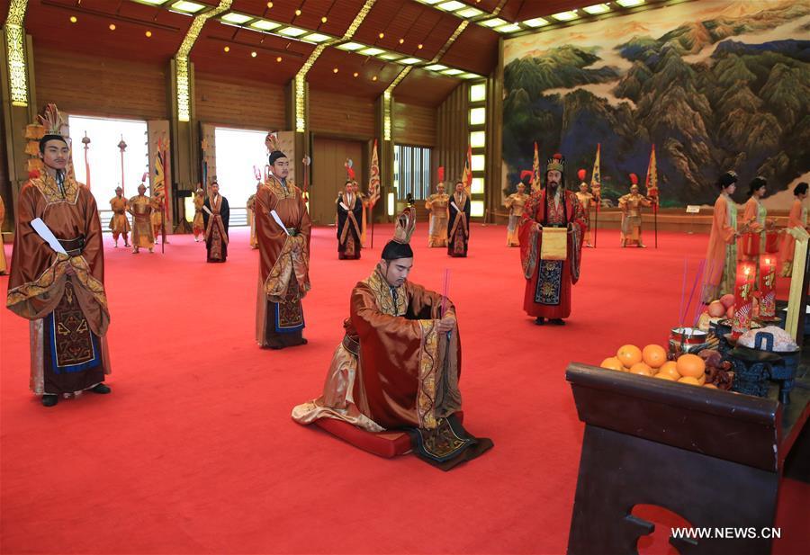 Performance of a sacrificial ceremony marking the Winter Solstice is held in Daming Palace National Heritage Park in Xi'an, capital of northwest China's Shaanxi Province, Dec. 21, 2016. (Photo: Xinhua/Shao Rui)