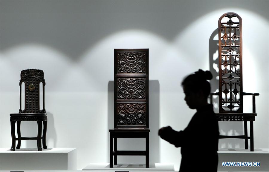 People watch works designed by Chinese painter, sculptor and designer Han Meilin at an exhibition to celebrate the artist's 80th birthday at National Museum of China in Beijing, capital of China, Dec. 21, 2016. Han Meilin was named as UNESCO Artist for Peace in 2015. (Photo: Xinhua/Gao Jing)