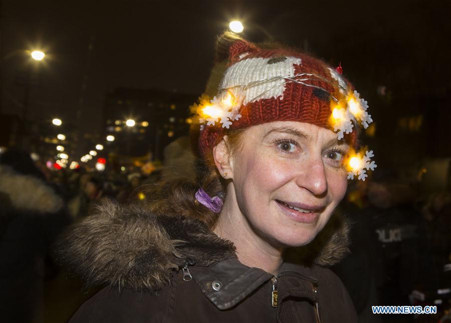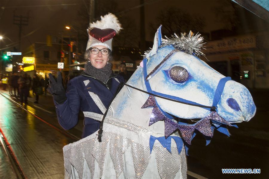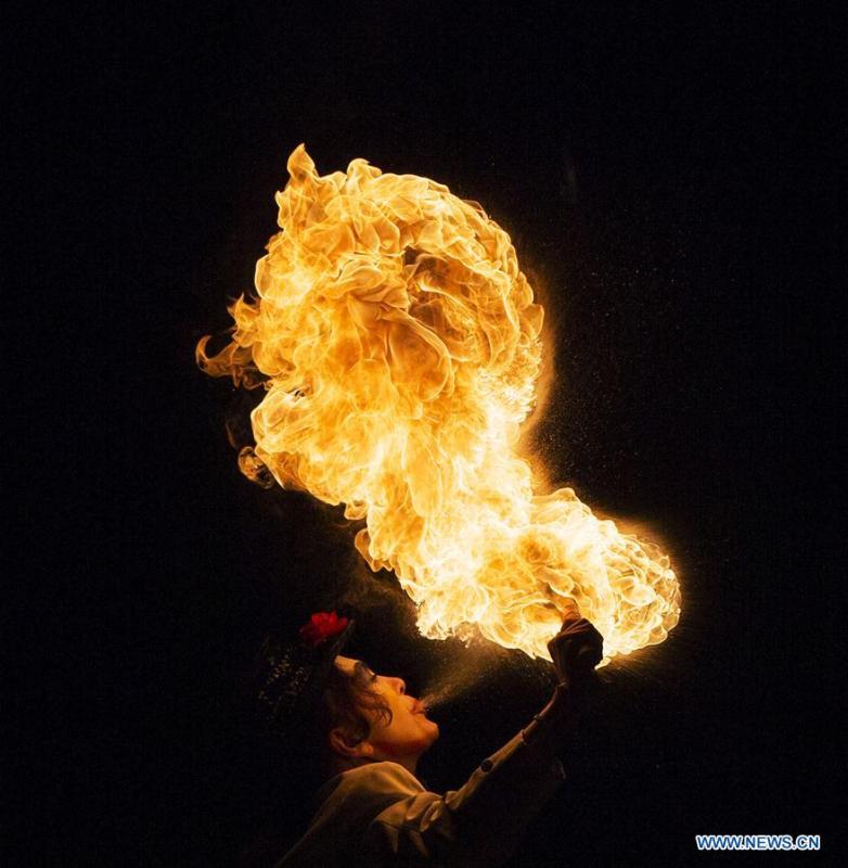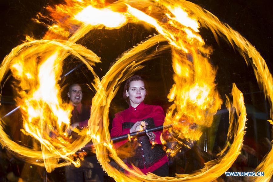 A performer plays with fire during the 2016 Kensington Market Winter Solstice Festival in Toronto, Canada, Dec. 21, 2016. With lanterns, fire and unique performances, the Toronto's traditional event celebrated the longest night of the year on Wednesday. (Photo: Xinhua/Zou Zheng)