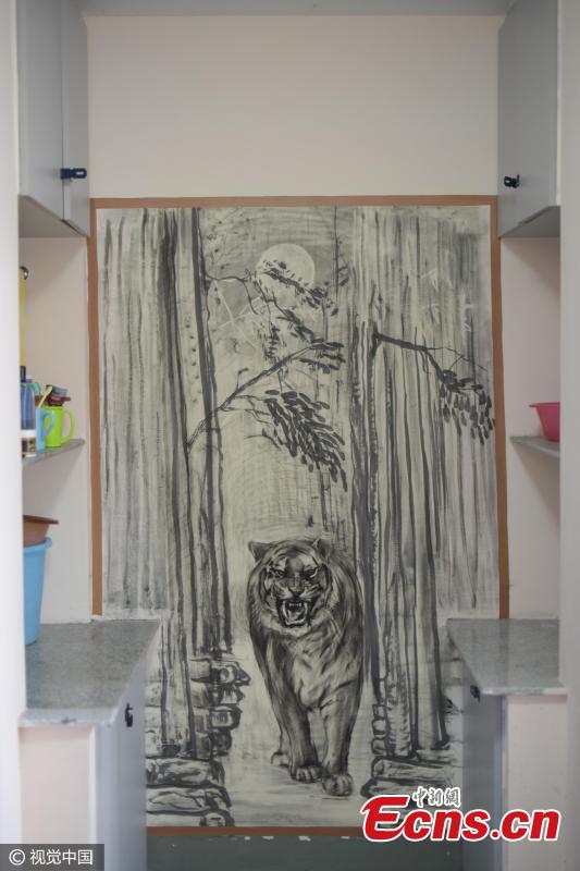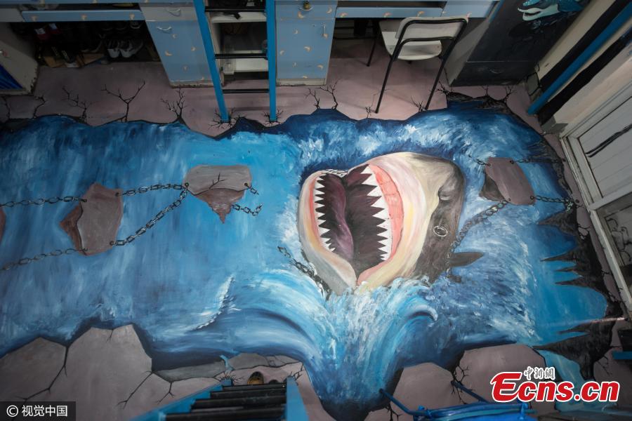 Chen Xianquan, an art student from Zhejiang Fashion Institute of Technology shows his dormitory decorated with 3D paintings on walls and floor in East China's Zhejiang province. The paintings were all created by the first-year university student. (Photo/CFP)