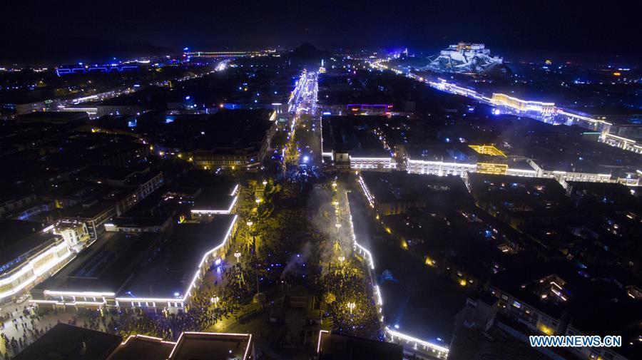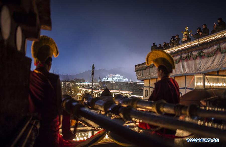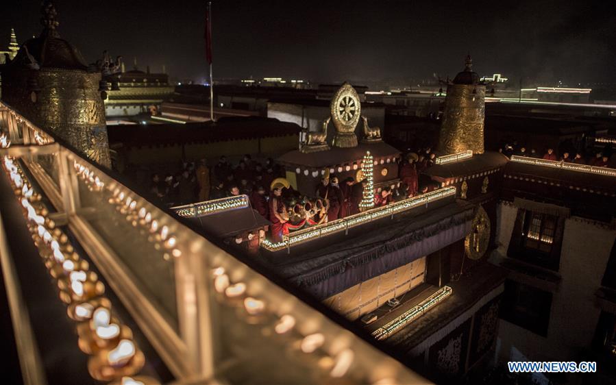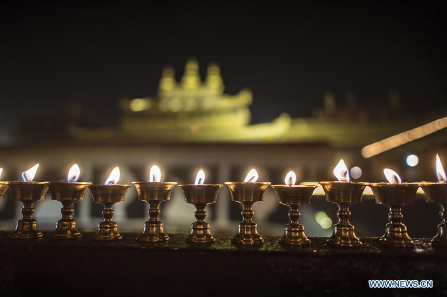 A monk lights butter lamps on the top of the Jokhang Temple in the heart of Lhasa, capital of southwest China's Tibet Autonomous Region, Dec. 23, 2016. Tibetans lit butter lamps and prayed through the night in an annual festival commemorating Tsong Khapa, a master of Tibetan Buddhism. (Xinhua/Purbu Zhaxi)