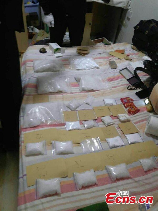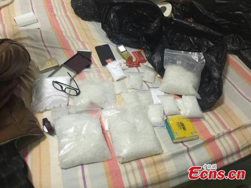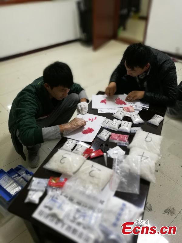 Police examine bags of drugs during a raid in Guiyang City, the capital of Southwest China’s Guizhou Province. Police caught five suspects, who smuggled drugs from Hunan Province to Guizhou, and also seized 5.644 kilograms of drugs. (Photo provided to China News Service)
