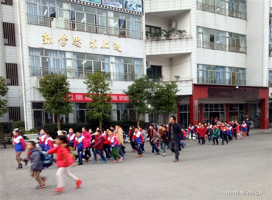 Pupils are evacuated to outdoor place after earthquake at Xichan Elementary School in Dazu District of Chongqing, southwest China, Dec. 27, 2016. A 4.8-magnitude earthquake hit Chongqing on Tuesday morning. So far, no casualties have been reported. (Photo/Xinhua)