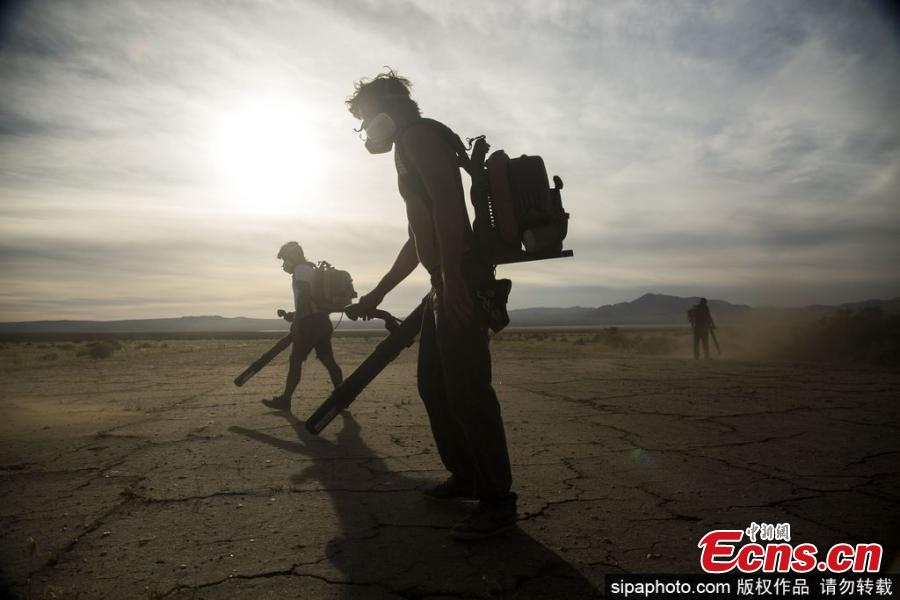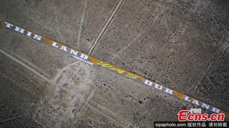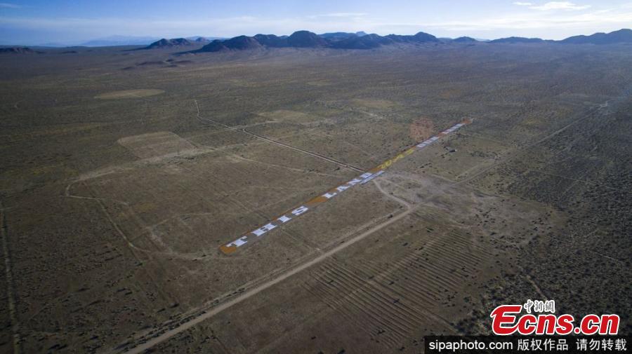 An aerial picture shows the world's largest piece of illegal graffiti - stretching about 945 meters across a remote part of southern California. The graffiti, which spells out the message 'This land was out land' is set against the barren background of an active military drone testing facility, in the middle of the Mojave Desert. The artwork is 20 meters tall by 945 meters long while 250 gallons of paint were used. (Photo/SipaChina)