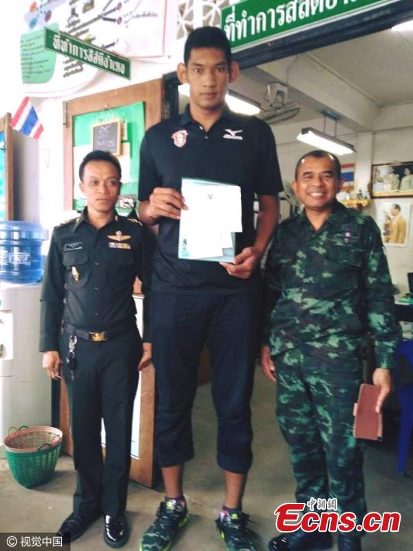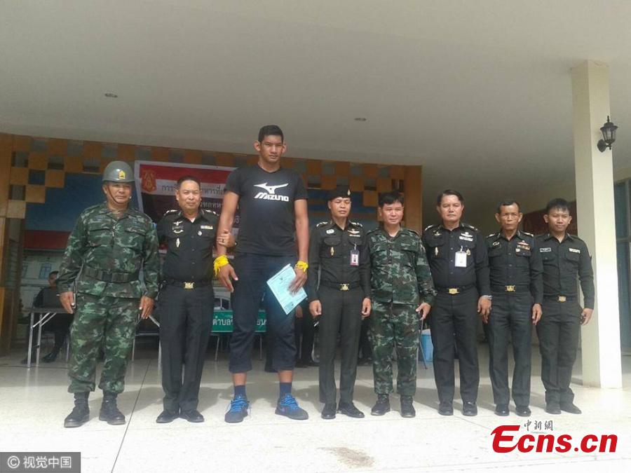 Wuttichai Suksara, aka Golf, joins the army in Thailand. Golf stands at 2.22 meters and is the tallest volleyball player in the world. (Photo/CFP)