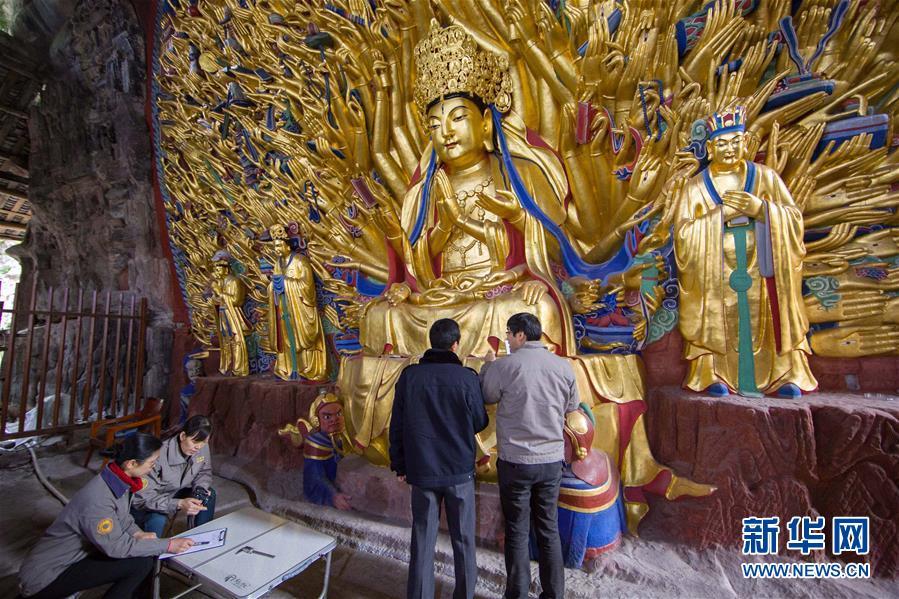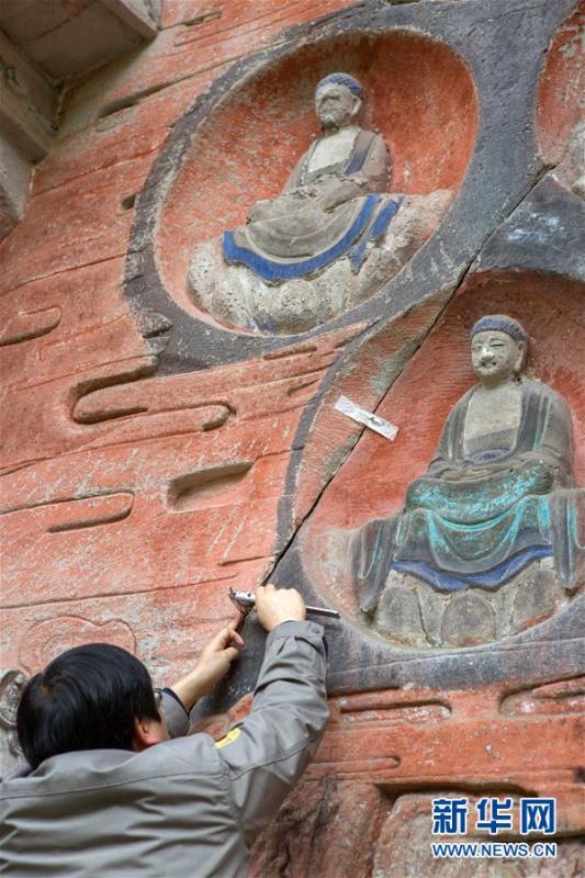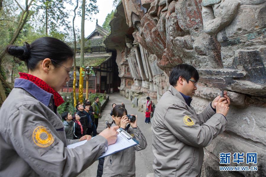 Workers check for damage at the Dazu Rock Carvings yesterday in Chongqing after a 4.8-magnitude earthquake hit the city. Listed as a World Heritage Site in 1999, the carvings are made up of 75 protected sites containing some 50,000 statues, dating back as far as the 7th century, depicting and influenced by Buddhist, Confucian and Taoist beliefs. No damage to the relics was reported. (Photo/Xinhua)