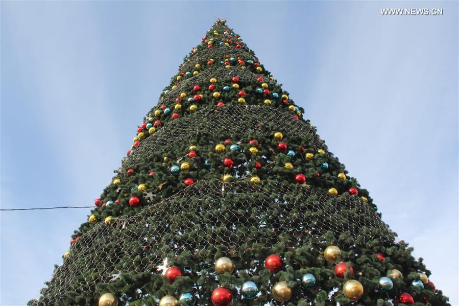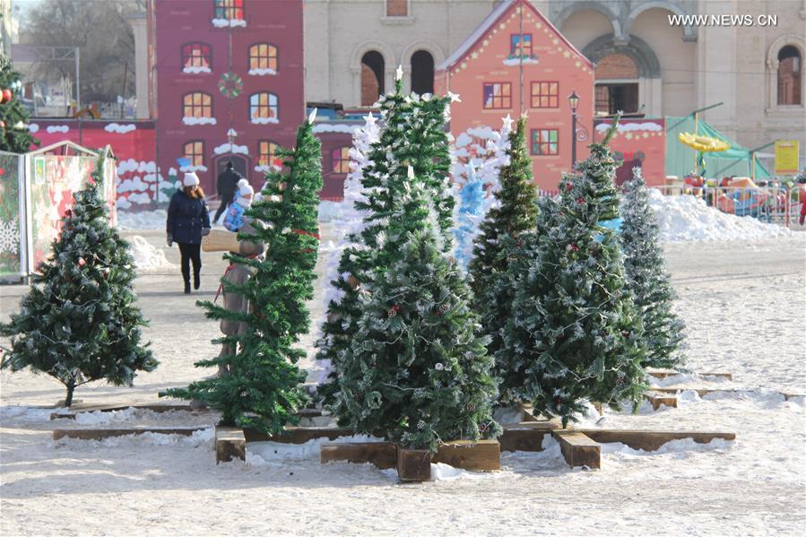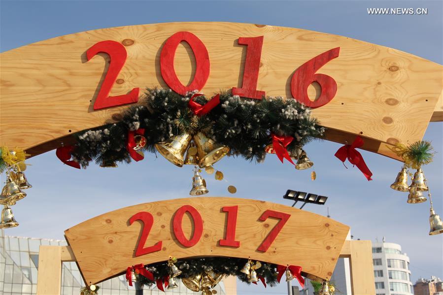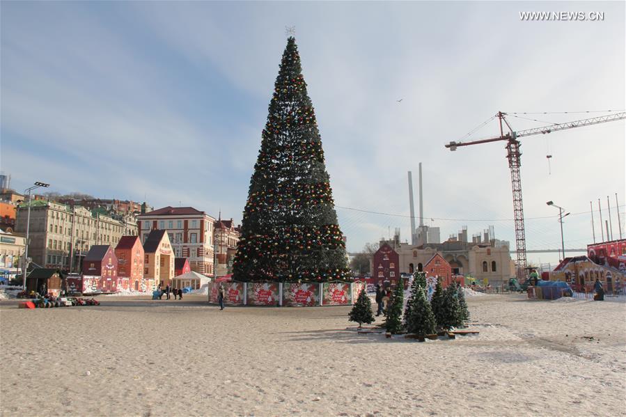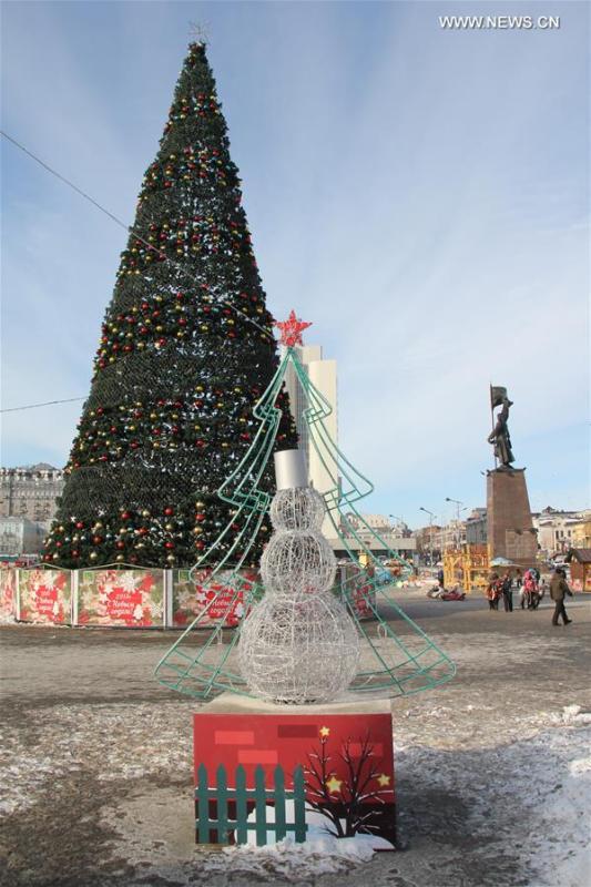 Christmas decorations are seen at the central square in Vladivostok, Russia, Dec. 28, 2016. (Xinhua/Wu Gang)