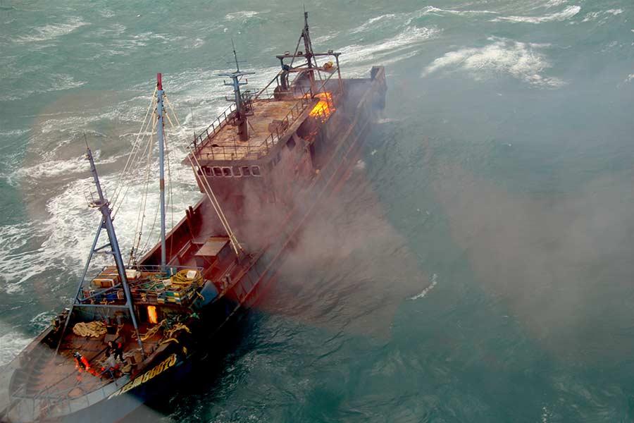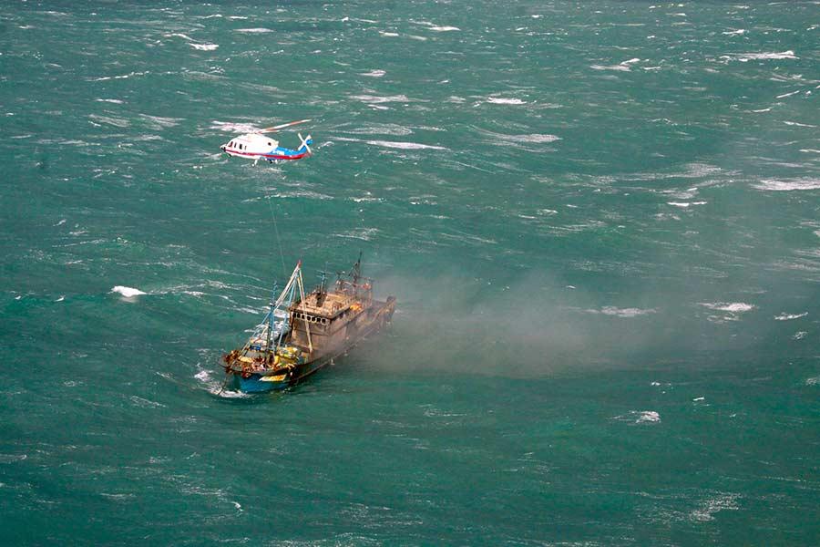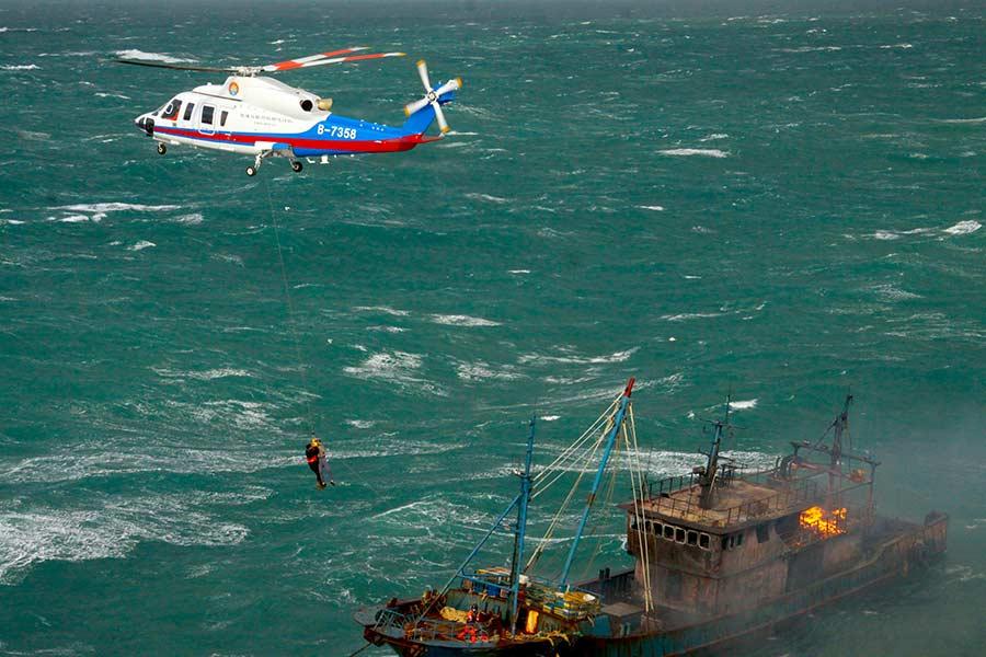 A Chinese rescue helicopter removes crew members from a fishing boat in the East China Sea after the boat's engine caught fire and burned out of control about 165 kilometers southeast of Shanghai on Tuesday. All 10 on board the boat were saved. (Photo/Asianewsphoto)