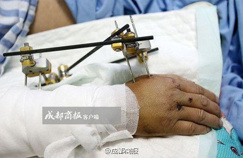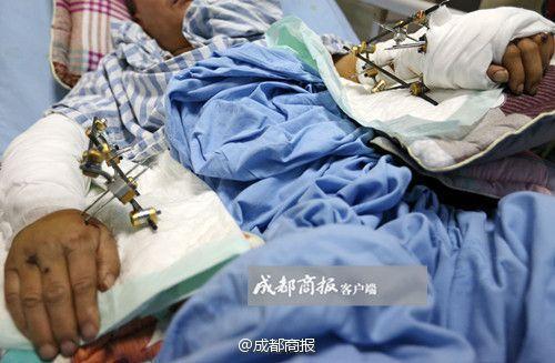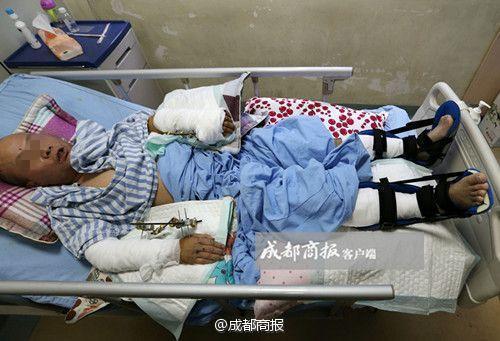 Breeder Wei Hua receives treatment after he got attacked by giant panda Xi Mei at a hospital in Chengdu City, the capital of Southwest China’s Sichuan Province. Wei Hua’s foot and wrist was seriously injured and may take a long time to heal, according to the hospital. Wei said he can’t hate the panda and has forgiven it. (Photo/Weibo of Chengdu Business Daily)