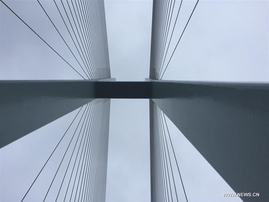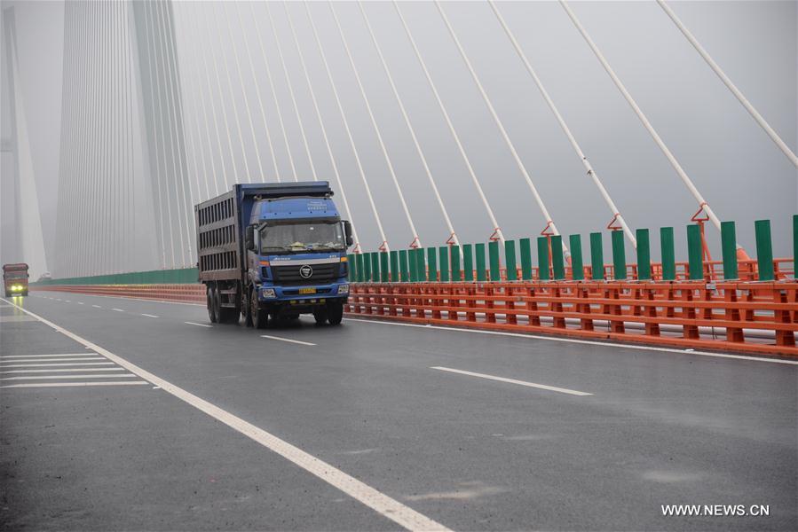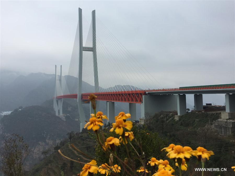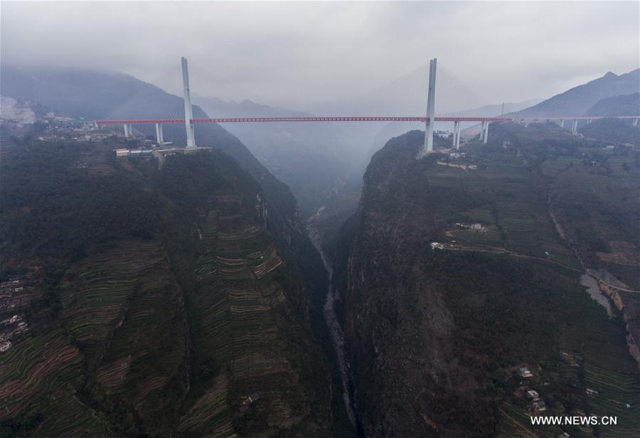 Photo taken on Dec. 29, 2016 shows the Beipanjiang Bridge linking Duge Township of Liupanshui City in southwest China's Guizhou Province and Puli Townshp under Xuanwei City in southwest China's Yunnan Province. The 1341.4-metre-long Beipanjiang Bridge was put into operation on Thursday.(Xinhua/Pu Chao)