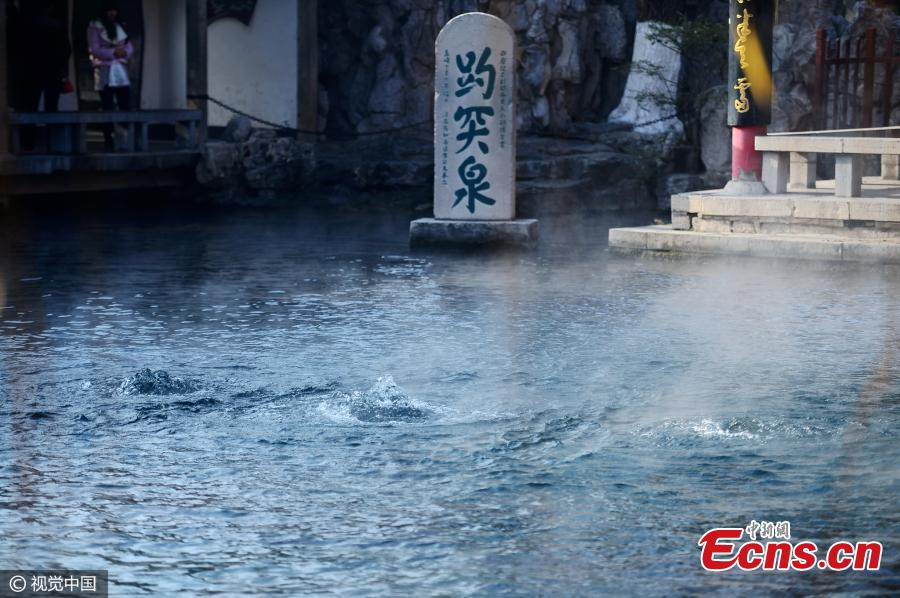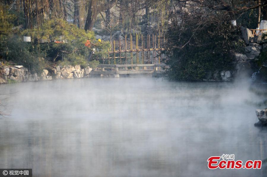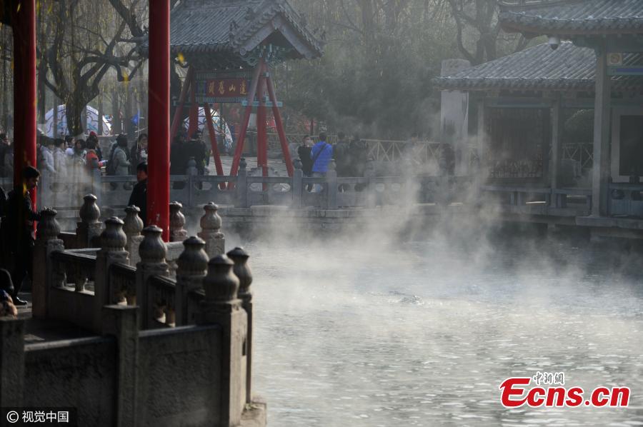 Mist hangs over the Baotu Spring in Jinan City, the capital of East China’s Shandong Province, Dec. 29, 2016. Local temperatures dropped to minus 6.9 degrees centigrade, helping to add charm to the popular tourism site. (Photo/CFP)