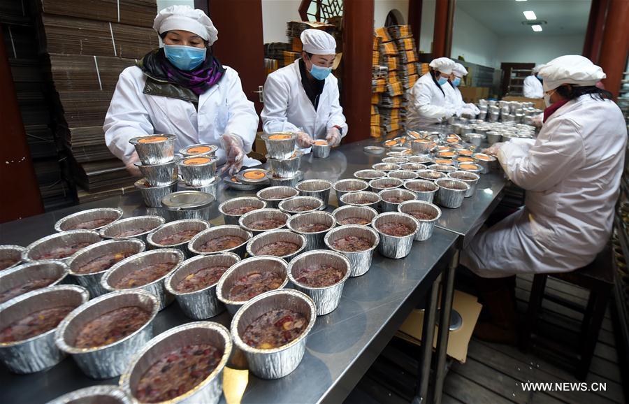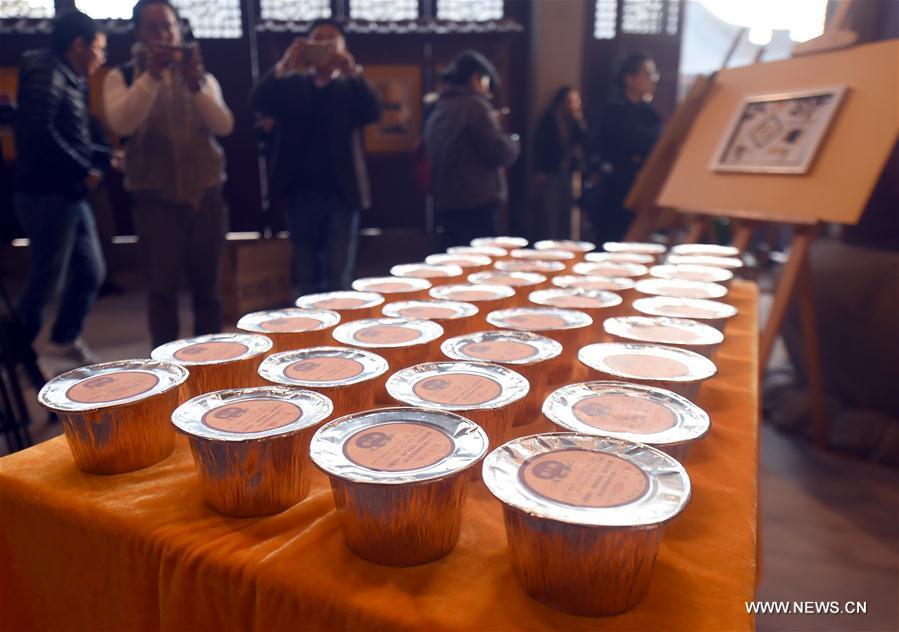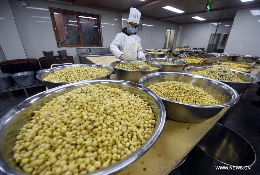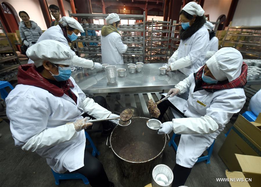 Laba porridge, a kind of rice porridge with nuts and dried fruit eaten on the eighth day of the twelfth lunar month which falls on the Jan. 5 next year, are seen at Lingyin Temple in Hangzhou, east China's Zhejiang Province, Dec. 30, 2016. Linyin Temple were busy in preparing laba porridge which would be distributed to citizens and tourists for free at the temple and to some hospitals, nursing homes, welfare houses and migrant schools etc.. (Xinhua/Wang Dingchang)