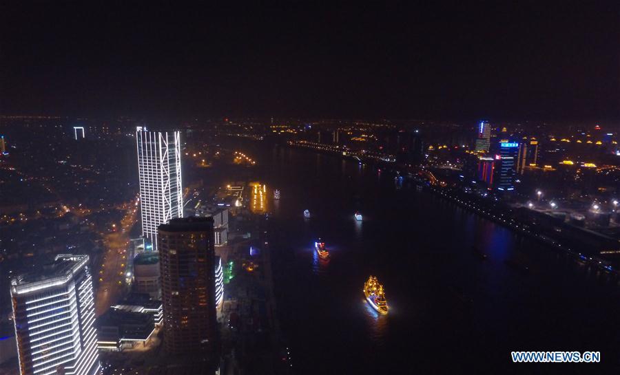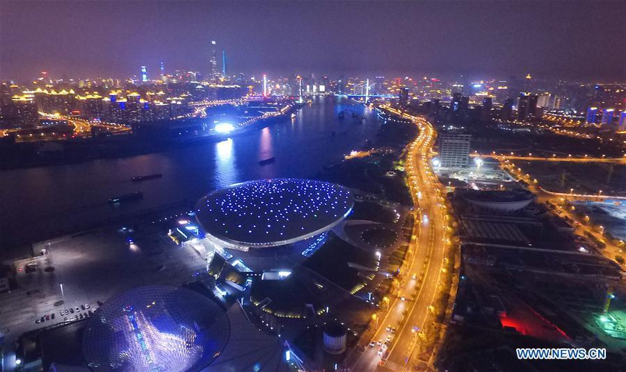Aerial photo taken on Dec. 31, 2016 shows the night scenery of Shanghai, east China, Dec. 31, 2016. (Xinhua/Ding Ting)