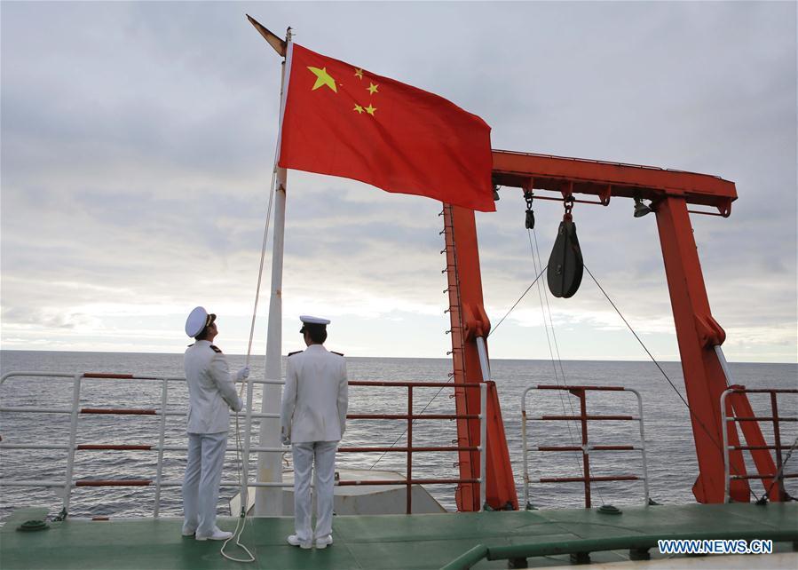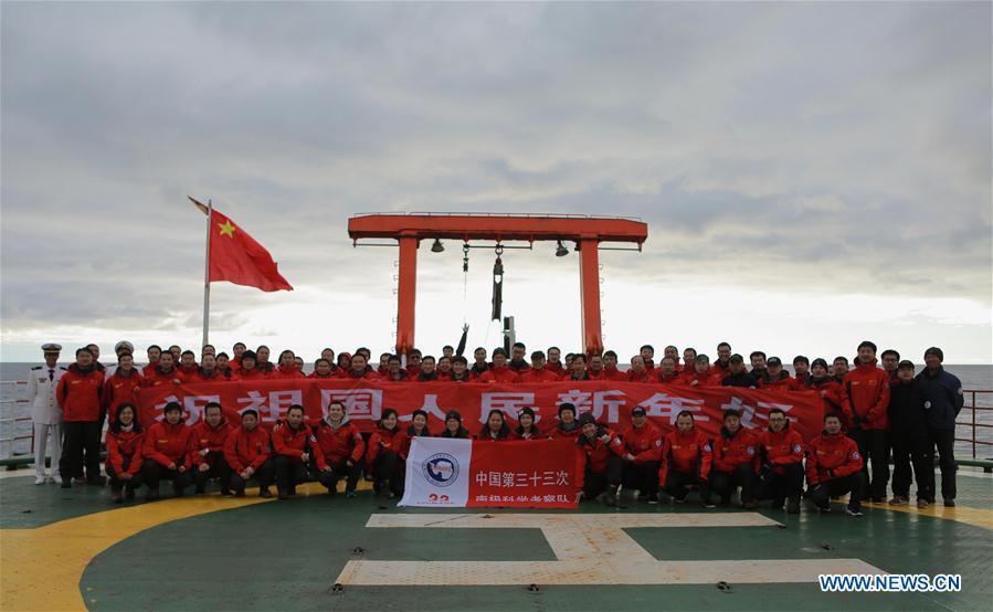A flag raising ceremony is held on the China's icebreaker Xuelong, Jan. 1, 2017. Chinese research vessel and icebreaker Xuelong (Snow Dragon) is on its 33rd Antarctic expedition. (Xinhua/Rong Qihan)