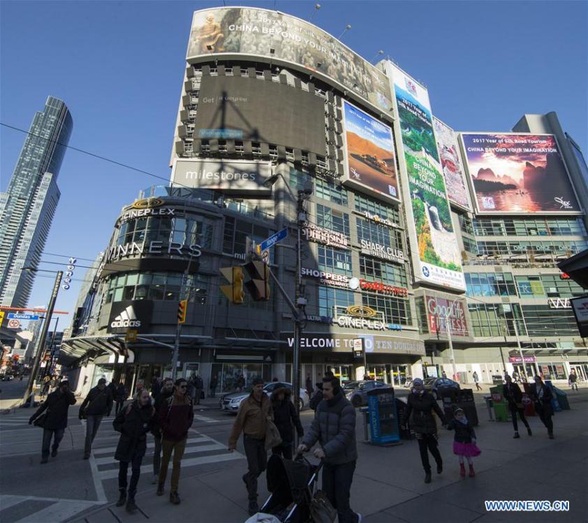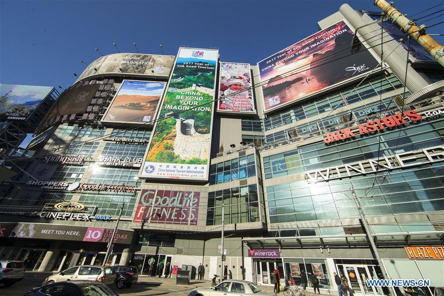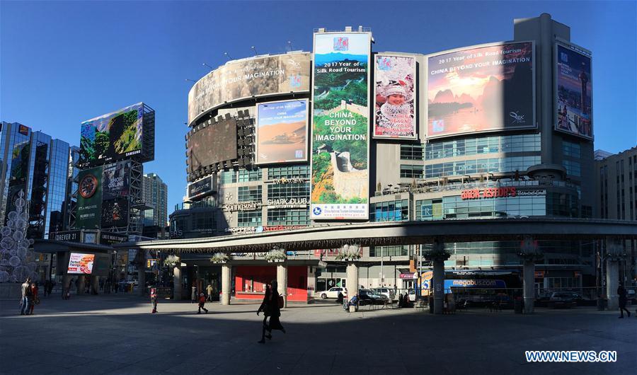 Advertising boards of the "Beautiful China - 2017 Year of Silk Road Tourism" are seen on the building at the Dundas Square in Toronto, Canada, Jan. 1, 2017. China National Tourism Administration launched a five-week promotion of the "Beautiful China - 2017 Year of Silk Road Tourism" on Dec. 26, 2016, hoping to attract Canadians' intensive attention during the holiday season. (Xinhua/Zou Zheng)