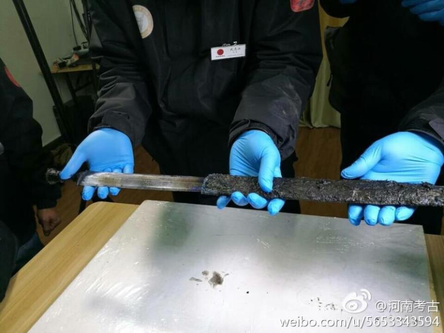 It is believed to date from the period of the Warring States (475 BC -221BC). Amazingly it was still shining as an archaeologist pulled it from its scabbard. (Photo/Sina Weibo)
