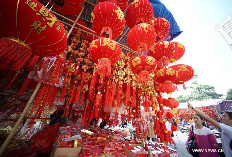 People select New Year decorations at a market in Nanning, capital of south China's Guangxi Zhuang Autonomous Region, Jan. 4, 2017. The Spring Festival, or Chinese Lunar New Year, will fall on Jan. 28 this year. (Xinhua/Zhou Hua)