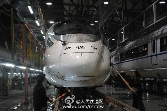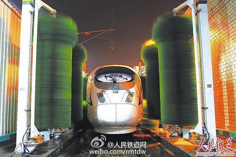 A high-speed train is cleaned. The cleanup involves both automatic and manual efforts that last about 45 minutes per train. The locomotive needs to be washed four times by workers. Recently, a picture of a high-speed train that had become shockingly dirty after passing through regions suffering serious air pollution went viral online. (Photo/peoplerail.com)