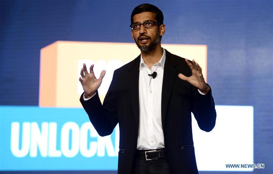 Chief Executive Officer of Google Inc. Sundar Pichai speaks at the launching event of "Digital Unlocked", a training program initiated by Google that will empower Indian small and medium-sized business owners with essential digital skills, in New Delhi, India, Jan. 4, 2017. (Xinhua/Partha Sarkar)