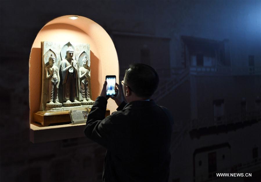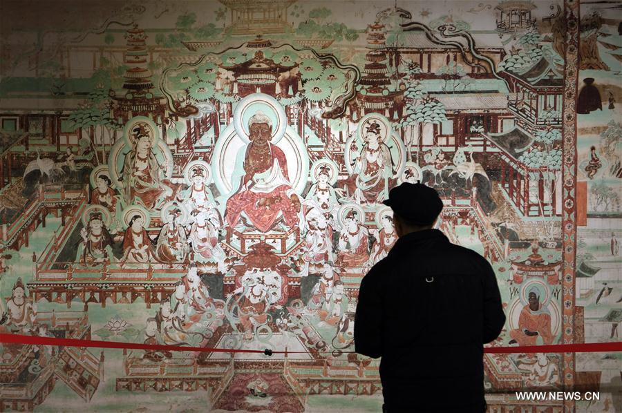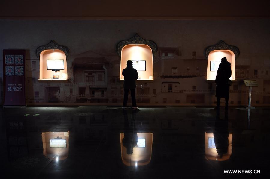 People visit a Dunhuang art exhibition in Lanzhou, capital of northwest China's Gansu Province, Jan. 4, 2017. The exhibition shows the art and history of Mogao Grottoes, which thrived as a Buddhist center in China from the 4th to the 14th centuries, through digital technology. (Xinhua/Fan Peishen)