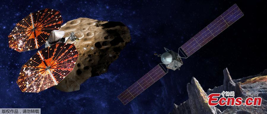 (Left) An artist’s conception of the Lucy spacecraft flying by the Trojan Eurybates – one of the six diverse and scientifically important Trojans to be studied. Trojans are fossils of planet formation and so will supply important clues to the earliest history of the solar system.(Right) Psyche, the first mission to the metal world 16 Psyche will map features, structure, composition, and magnetic field, and examine a landscape unlike anything explored before. Psyche will teach us about the hidden cores of the Earth, Mars, Mercury and Venus. NASA has selected two missions that have the potential to open new windows on one of the earliest eras in the history of our solar system – a time less than 10 million years after the birth of our sun. The missions, known as Lucy and Psyche, were chosen from five finalists and will proceed to mission formulation, with the goal of launching in 2021 and 2023, respectively. (Photo/NASA)