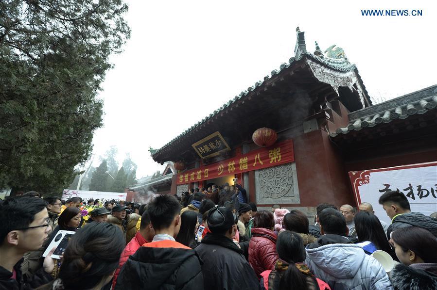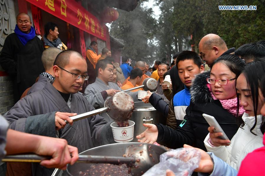 People get free Laba porridge at the Shaolin Temple in Dengfeng, central China's Henan Province, Jan. 5, 2017. The Laba Festival, a traditional Chinese festival on the eighth day of the 12th lunar month, fell on Jan. 5 this year. It's customary on this day to eat a special Laba porridge, usually made with at least eight ingredients, representing people's prayers for harvest. Many temples have the tradition of offering porridge to the public. (Xinhua/Feng Dapeng)
