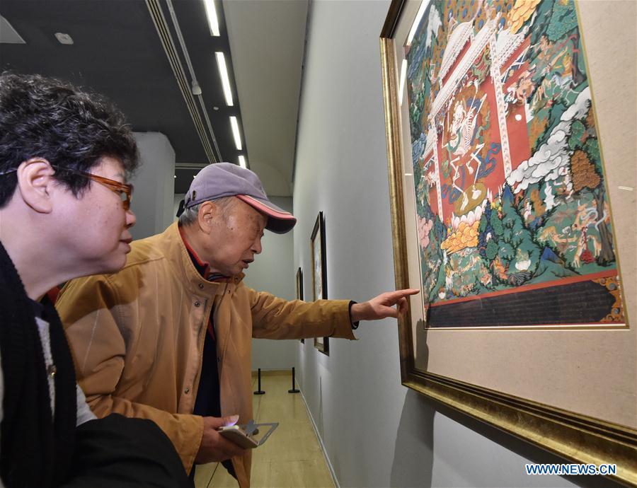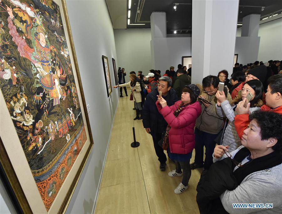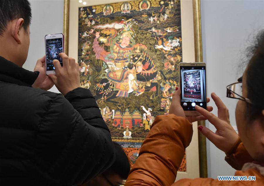 People take photos during an exhibition of Tibetan Thangka painting in Beijing, capital of China, Jan. 7, 2017. (Xinhua/Li He)