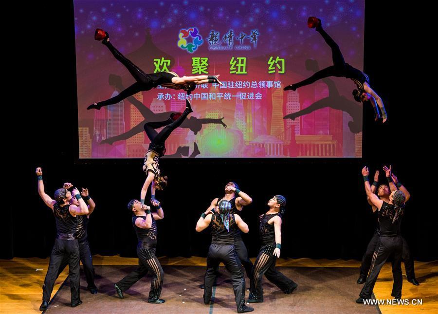 Representatives of the event organizers pose for a group photograph with performers after the 2017 "Embrace China-New York" grand performances gala in New York City, the United States, on Jan. 9, 2017. The gala, jointly hosted by All-China Federation of Returned Overseas Chinese (AFROC) and Consulate General of China in New York, provided an opportunity for overseas Chinese and Americans to enjoy contemporary Chinese cultural performances and celebrate the upcoming Chinese lunar New Year. (Xinhua/Li Rui)