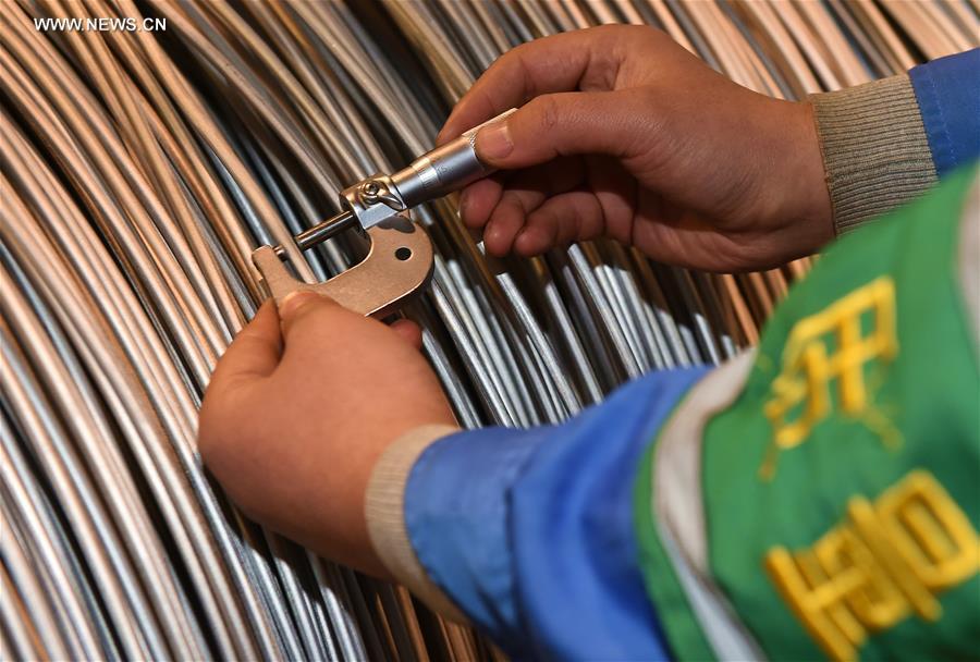 A worker measures steel components for pen tips at Taiyuan Iron and Steel (Group), or TISCO, in Taiyuan, north China's Shanxi Province, Jan. 10, 2017. China, the world's biggest manufacturer of ballpoint pens, has finally developed its own pen tips, ending a long-term reliance on imported ones. TISCO said it has mastered the production of steel components for pen tips after trying for five years. (Xinhua/Cao Yang)