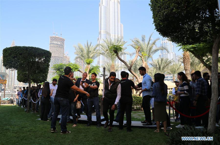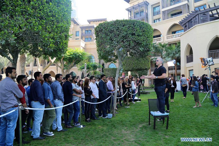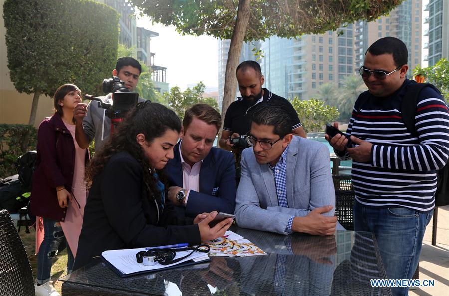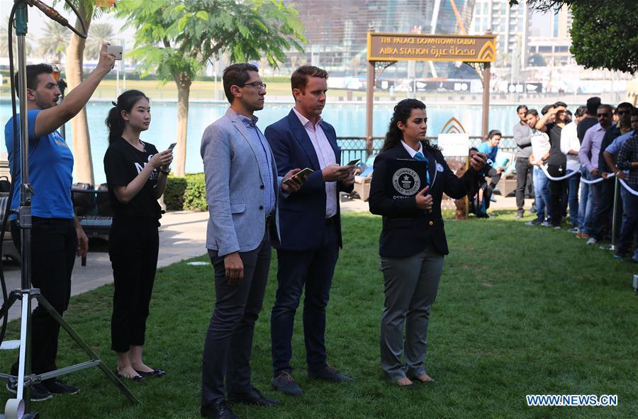 Representatives of Chinese ICT giant Huawei receive a certificate of Guinness World Records in Dubai, the United Arab Emirates (UAE), Jan. 10, 2017. Chinese ICT giant Huawei broke the Guinness World Record on Tuesday for the most selfies taken with different people in just three minutes in Dubai.The image featuring 160 participants was captured using the Huawei Mate 9 with Dubai's iconic Burj Khalifa in the background. (Xinhua/Li Zhen)