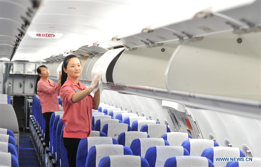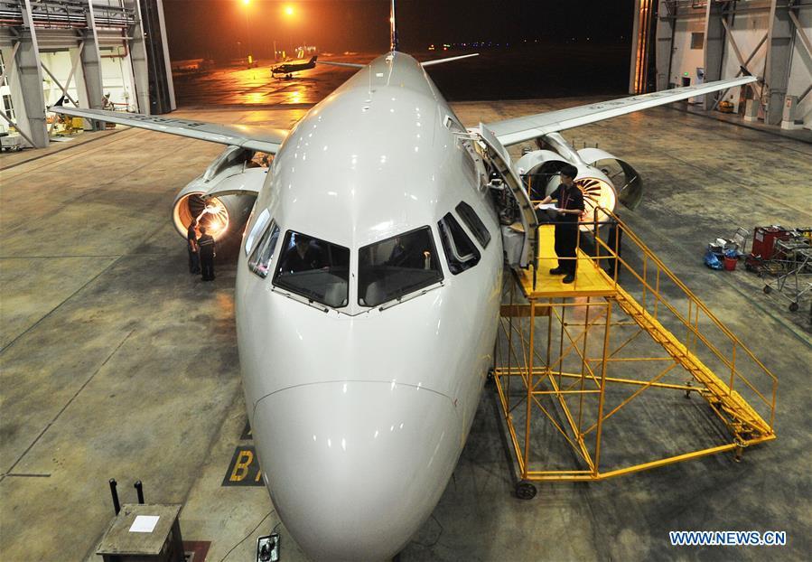 Technicians examine and maintain an aircraft at the maintenance base of China Southern Airlines in Haikou, capital of south China's Hainan Province, Jan. 10, 2017. China Southern Airlines check and clean airplanes to better cope with the upcoming Spring Festival travel rush. (Xinhua/Chu Hongyu)