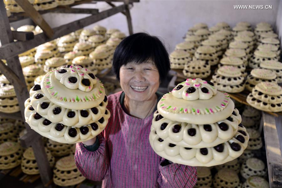 Villager Meng Guangfeng shows the newly-made steamed jujube cakes in Yanggu County of Liaocheng city, east China's Shandong Province, Jan. 11, 2017. Local people here have a tradition of making steamed bun with colorful patterns to send best wishes to the upcoming Spring Festival. (Xinhua/Zhao Yuguo)
