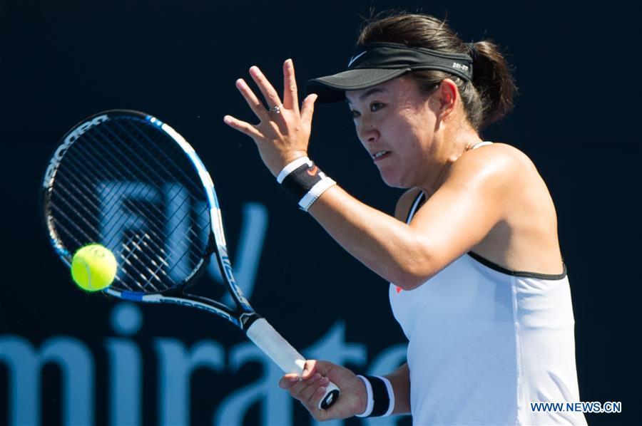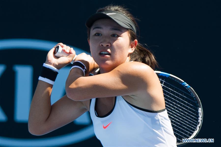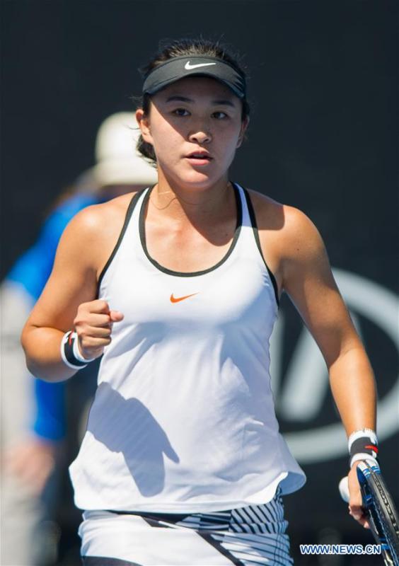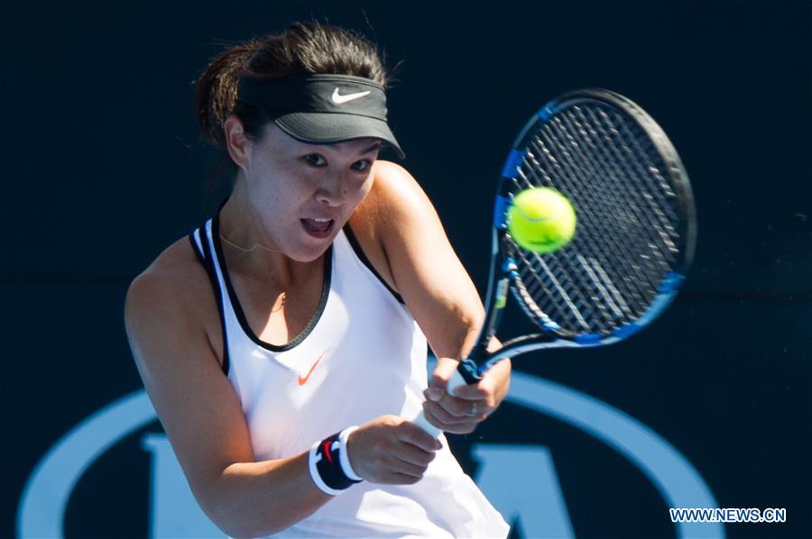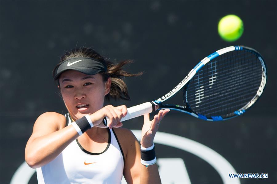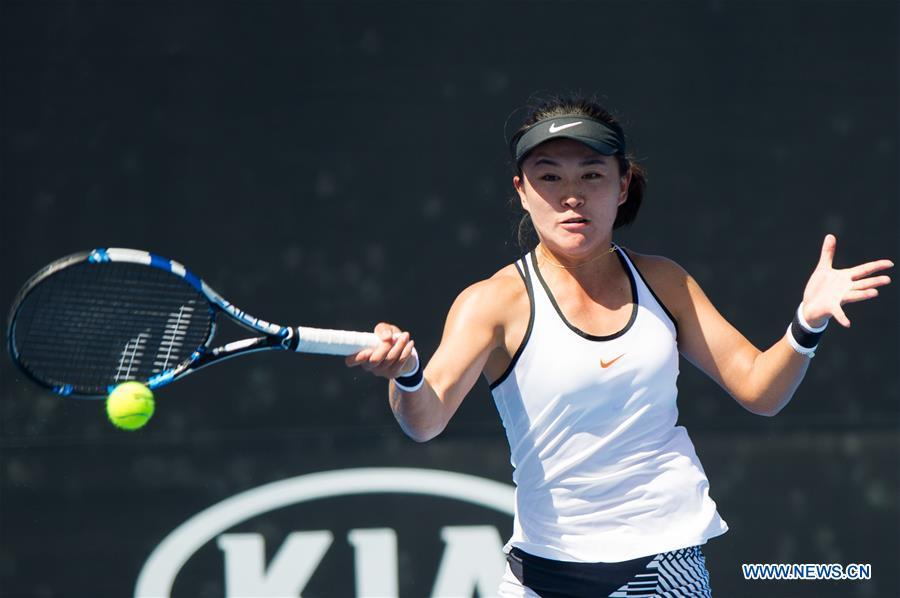 Zhu Lin of China hits the ball against Tammi Patterson of Australia during the women's singles first round of Australian Open 2017 qualifying match at Melbourne Park in Melbourne, Australia, Jan. 12, 2017. Zhu Lin won Tammi Patterson of Australia with 2-0. (Xinhua/Bai Xue)