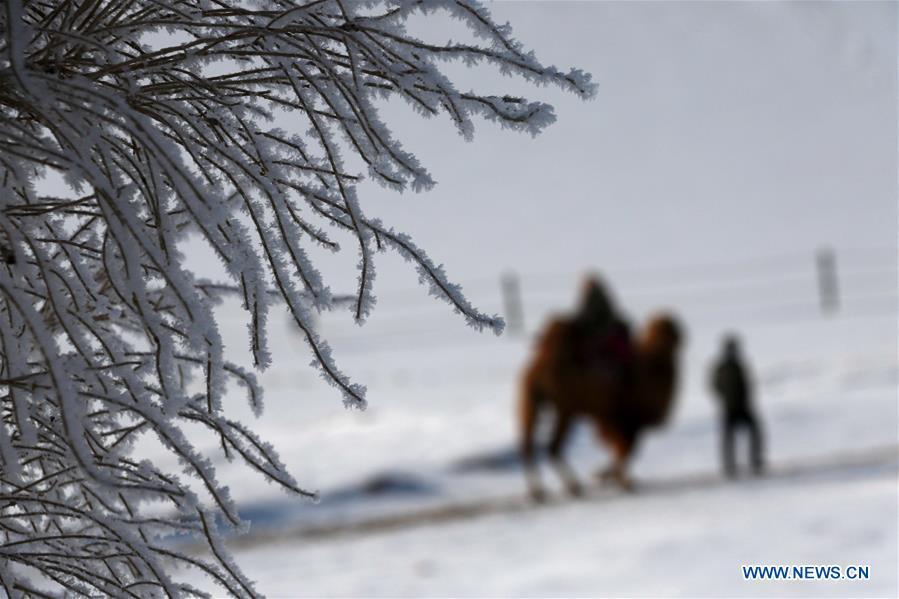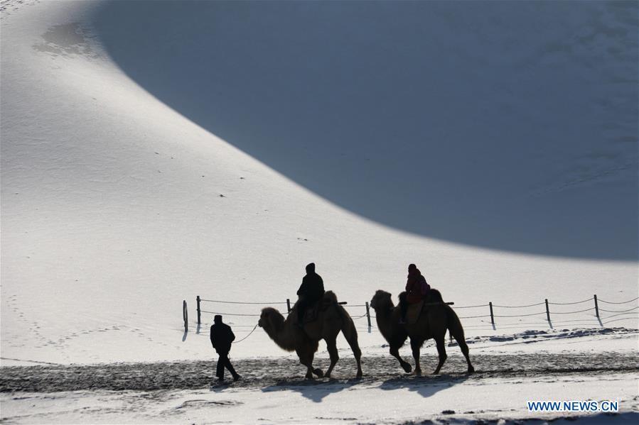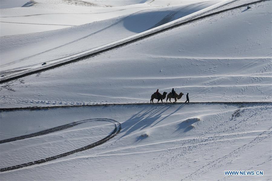 Visitors ride camels in the Crescent Spring and Singing Sand Dune scenic site of Dunhuang, northwest China's Gansu Province on Jan. 11, 2017. A recent snow made the scenic site decorated with pure white. (Xinhua/Zhang Xiaoliang)