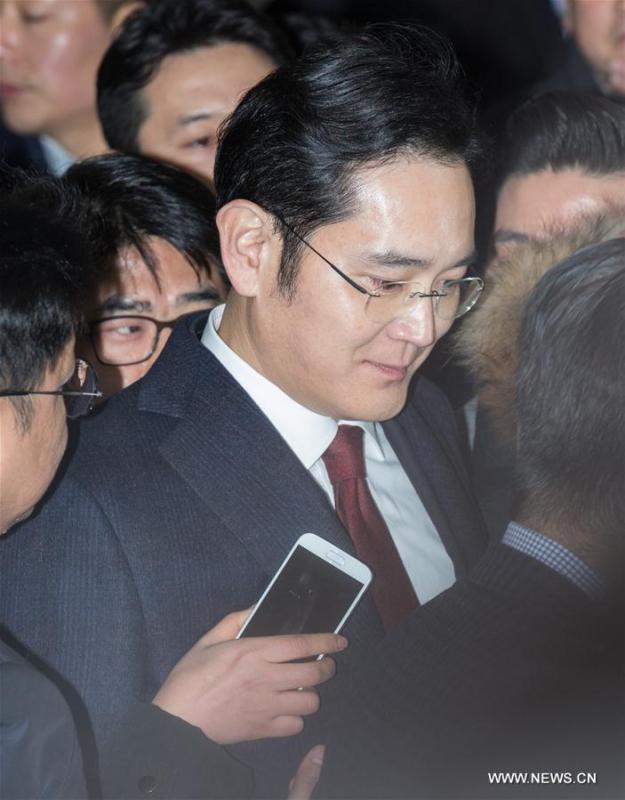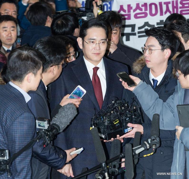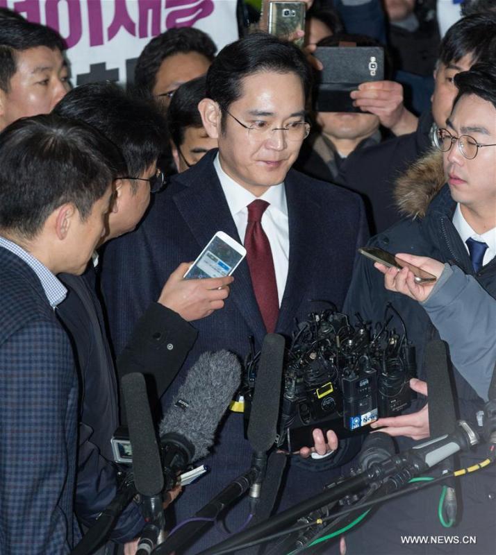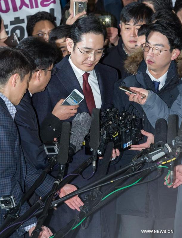Samsung Electronics Vice Chairman Lee Jae-yong receives interviews before questioning in Seoul, South Korea, Jan. 12, 2017. The heir apparent of Samsung Group, South Korea's largest conglomerate, appeared in the office of an independent counsel team investigating a scandal involving impeached President Park Geun-hye for his alleged involvement in bribery charges. (Xinhua/Lee Sang-ho)