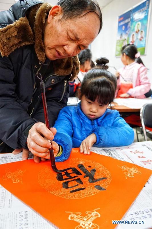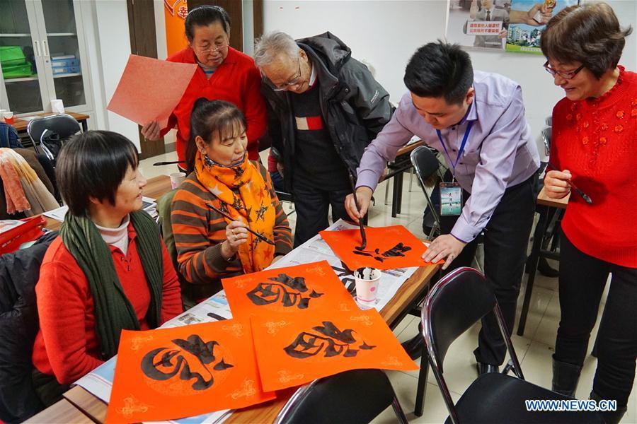 Children show their handwritten Chinese character "Fu", meaning happiness, blessing and good fortune, in a community in the Zhongguancun area in Beijing, capital of China, Jan. 12, 2017. The community on Thursday invited calligraphy lovers and residents to write the Chinese character "Fu" to celebrate the upcoming Chinese Lunar New Year. (Xinhua/Lin Xin)
