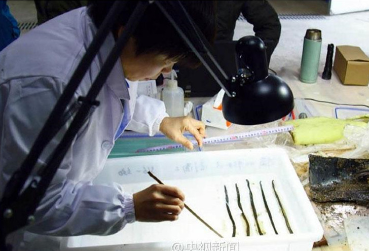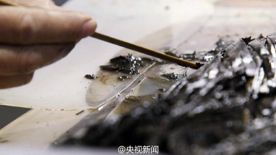 Experts study the bamboo slips unearthed from the Haihunhou tomb in Jiangxi Province. (Photo/Official Weibo account of CCTV)