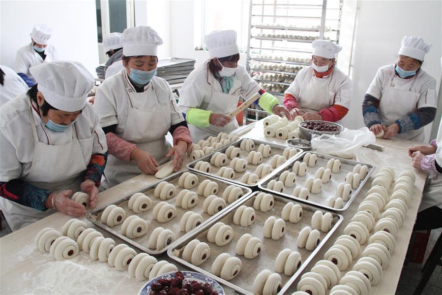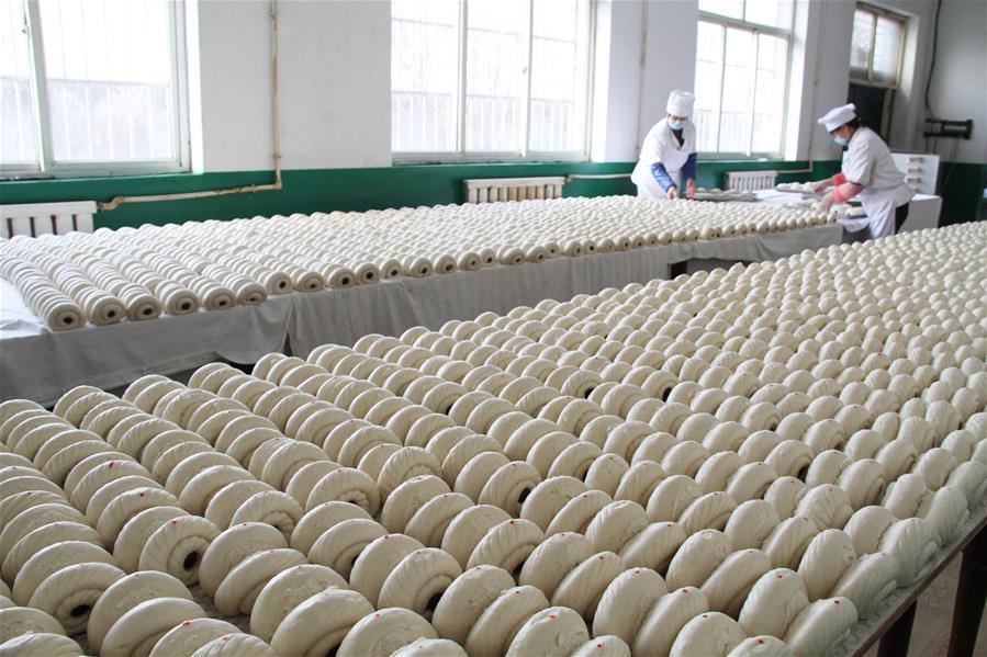 A worker paints a red dot on the surface of a steamed bun in the production base in Tuocun Village of Yangcheng County, north China's Shanxi Province, Jan. 12, 2017. The sales of traditional steamed buns are booming ahead of the Spring Festival, which falls on Jan. 28 this year. Over 90,000 steamed buns will be made this month to supply the local market and other cities. (Xinhua/Chen Yuanzi)