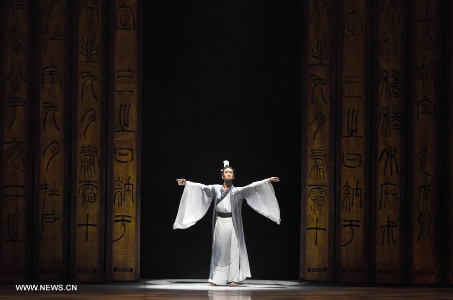 A performer dances during a media preview of Chinese dance drama Confucius at the Kennedy Center of the Performing Arts in Washington D.C., the United States, on Jan. 13, 2017. The Chinese dance drama performed by the China National Opera & Dance Drama Theater is presented in Washington from Jan. 13 to Jan. 15. (Photo: Xinhua/Yin Bogu)