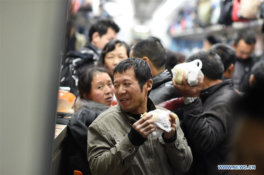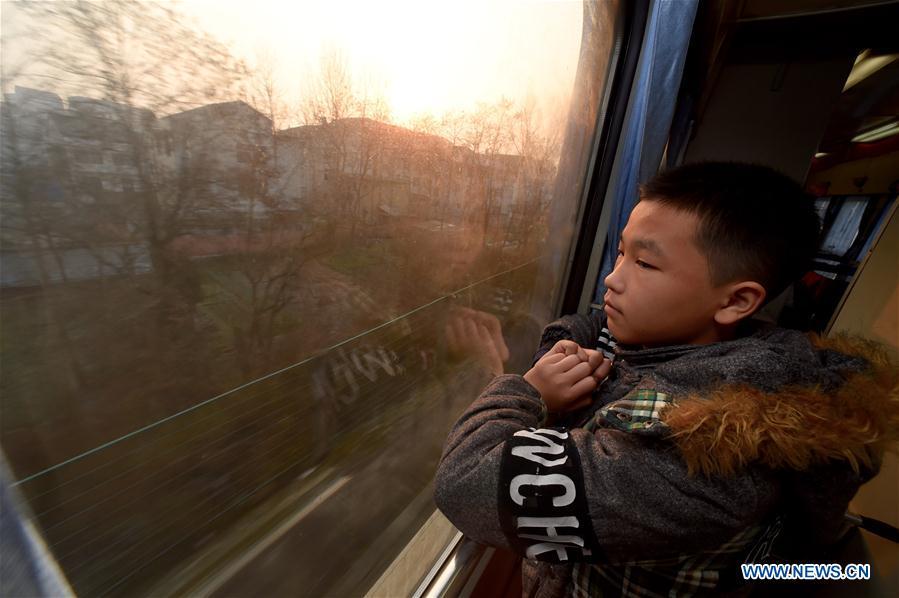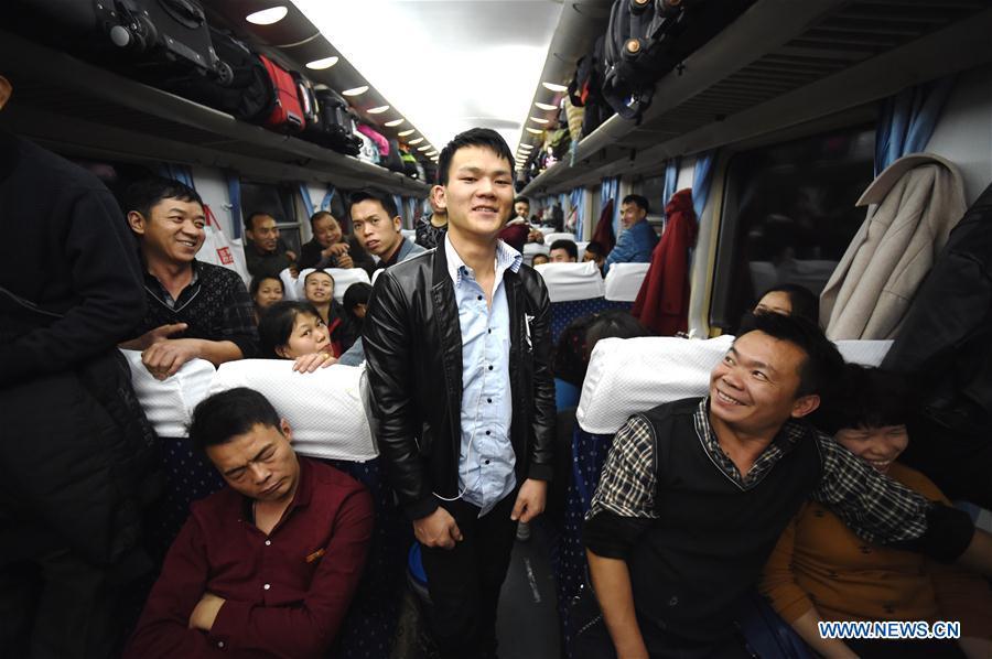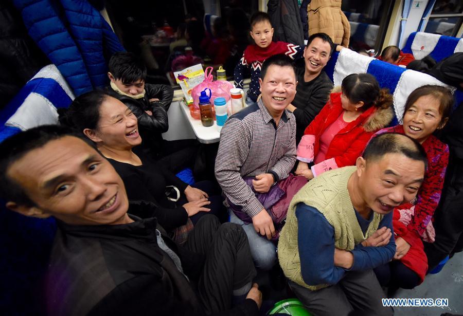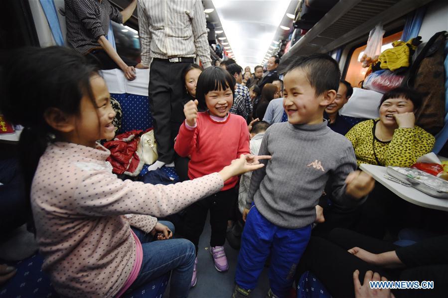 Children play games on the special train K4186 for migrant workers from Fuzhou of southeast China's Fujian Province to Guang'an of southwest China's Sichuan Province, Jan. 13, 2017. The train, during its 2,084-km-long journey, took over 2,500 migrant workers home at Fujian, Jiangxi, Hubei, Shaanxi and Sichuan provinces in over 27 hours. (Xinhua/Jiang Kehong)