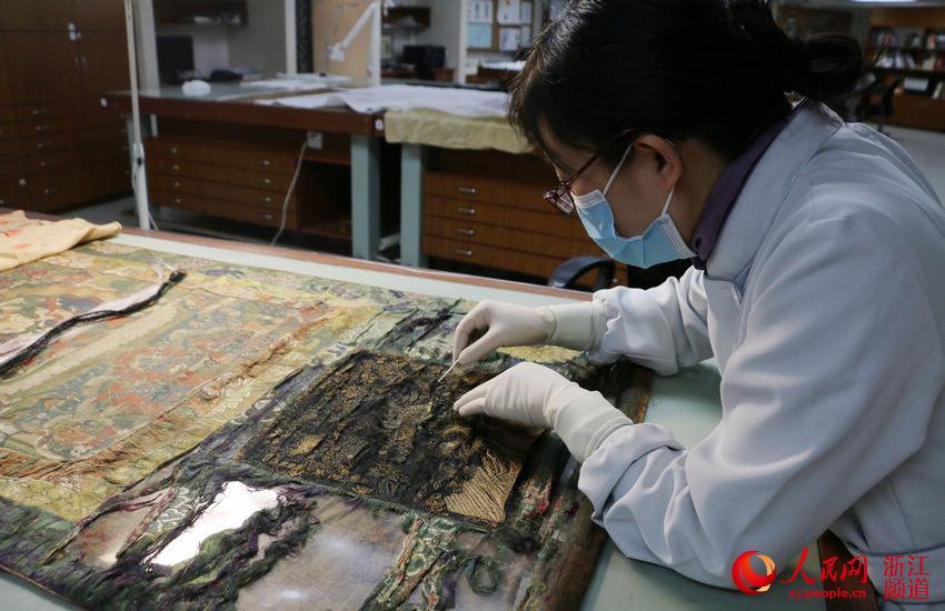 A restoration expert sews up a Thangka embroidery dating back over 200 years at China Silk Museum in Hangzhou, Zhejiang province. The restorer, Wang Shujuan, explained that the Thangka would be gradually repaired by adding layers of lining to the back of the textile. The Thangka was sent by Tibet Museum in October. Cultural heritage pieces made of silk are regularly sent to China Silk Museum for repair. (Photo/People's Daily Online)