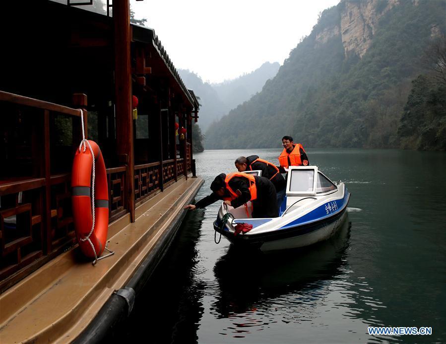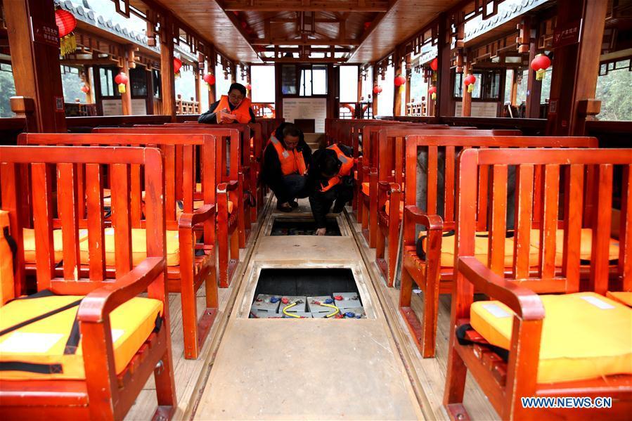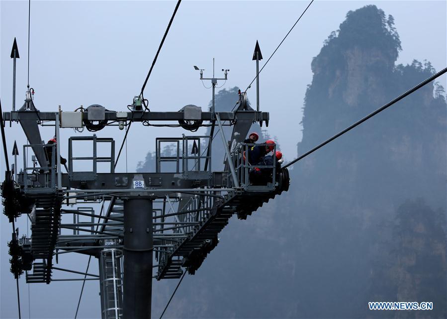 Staff members conduct safety inspection for cableways of Tianzi Mountain at Wulingyuan scenic area in Zhangjiajie, central China's Hunan Province, Jan. 16, 2017. Safety inspections were conducted in scenic areas of Zhangjiajie in order to safeguard tourism safety for the upcoming Spring Festival holiday. (Xinhua/Wu Yongbing)